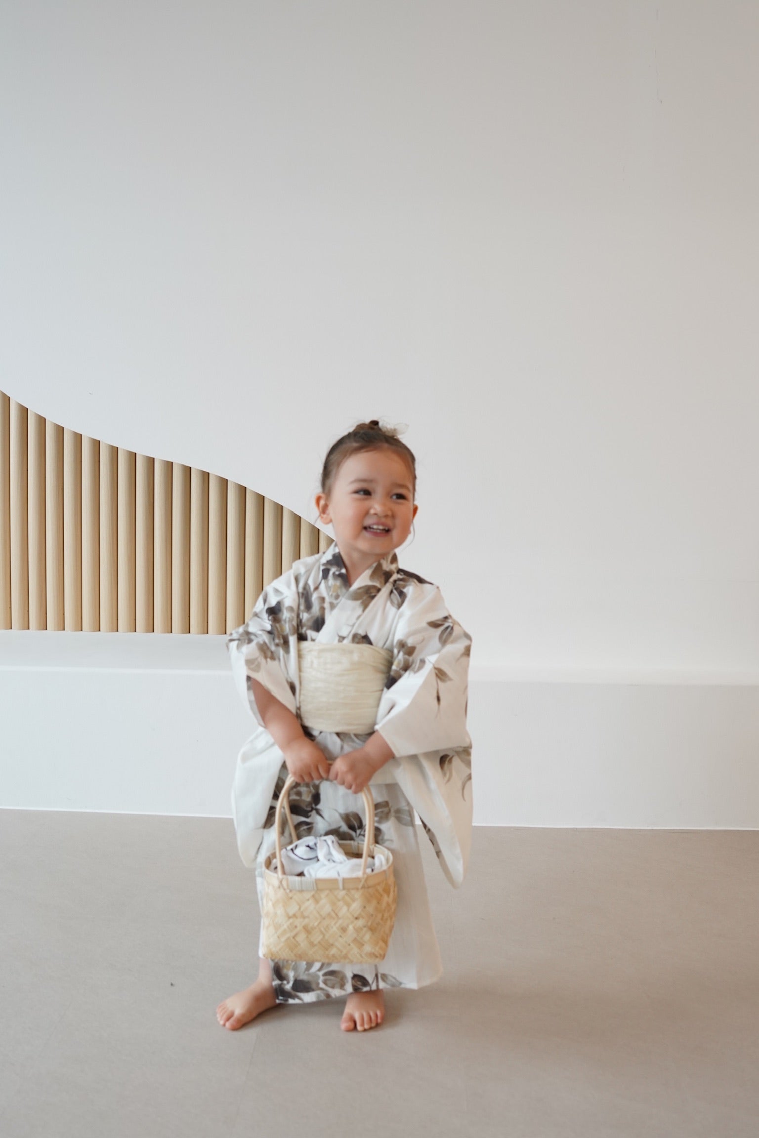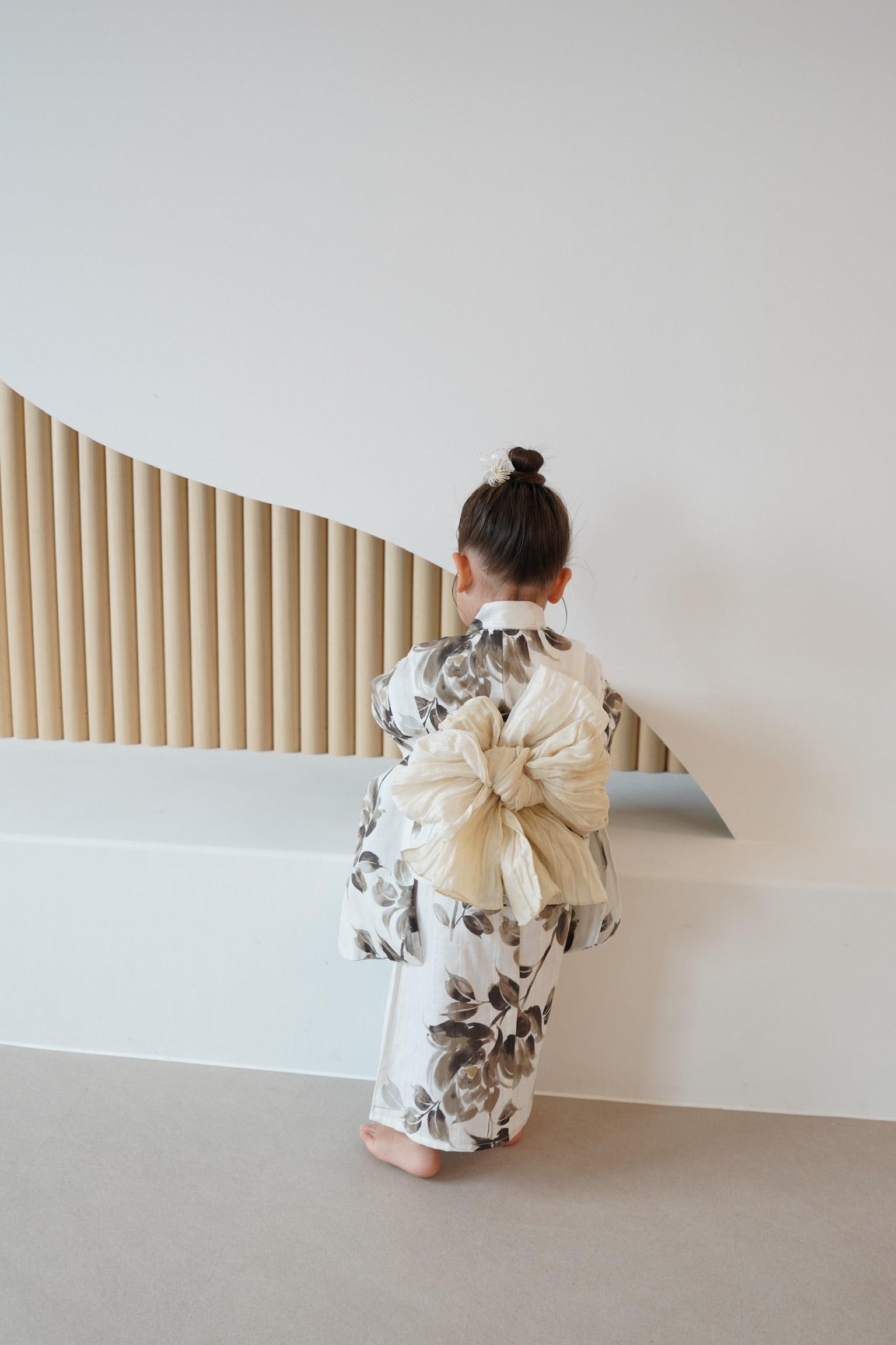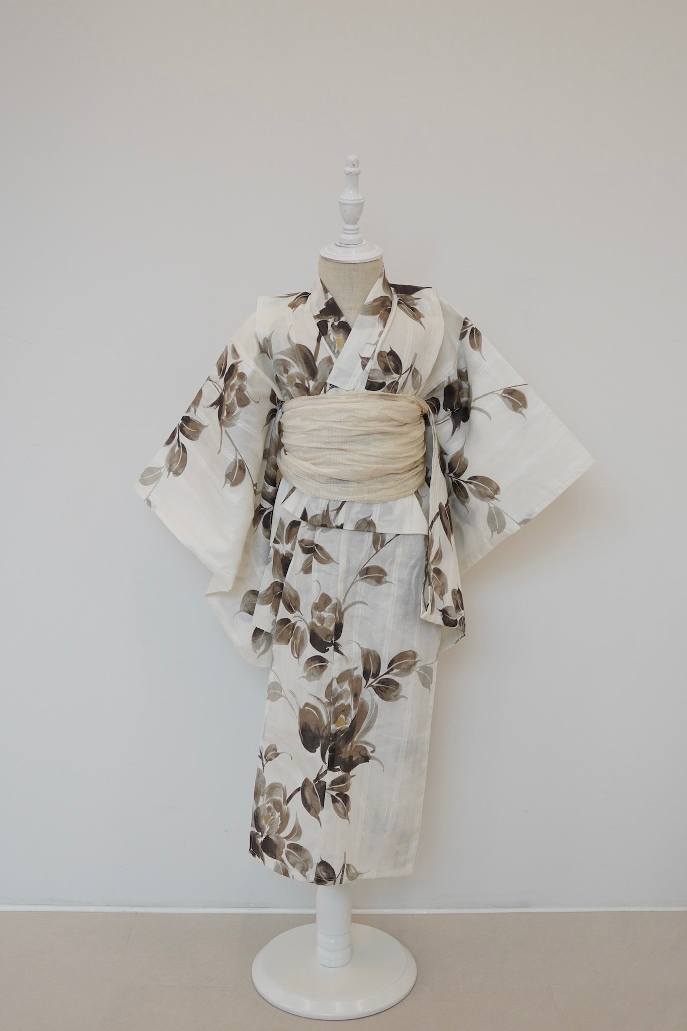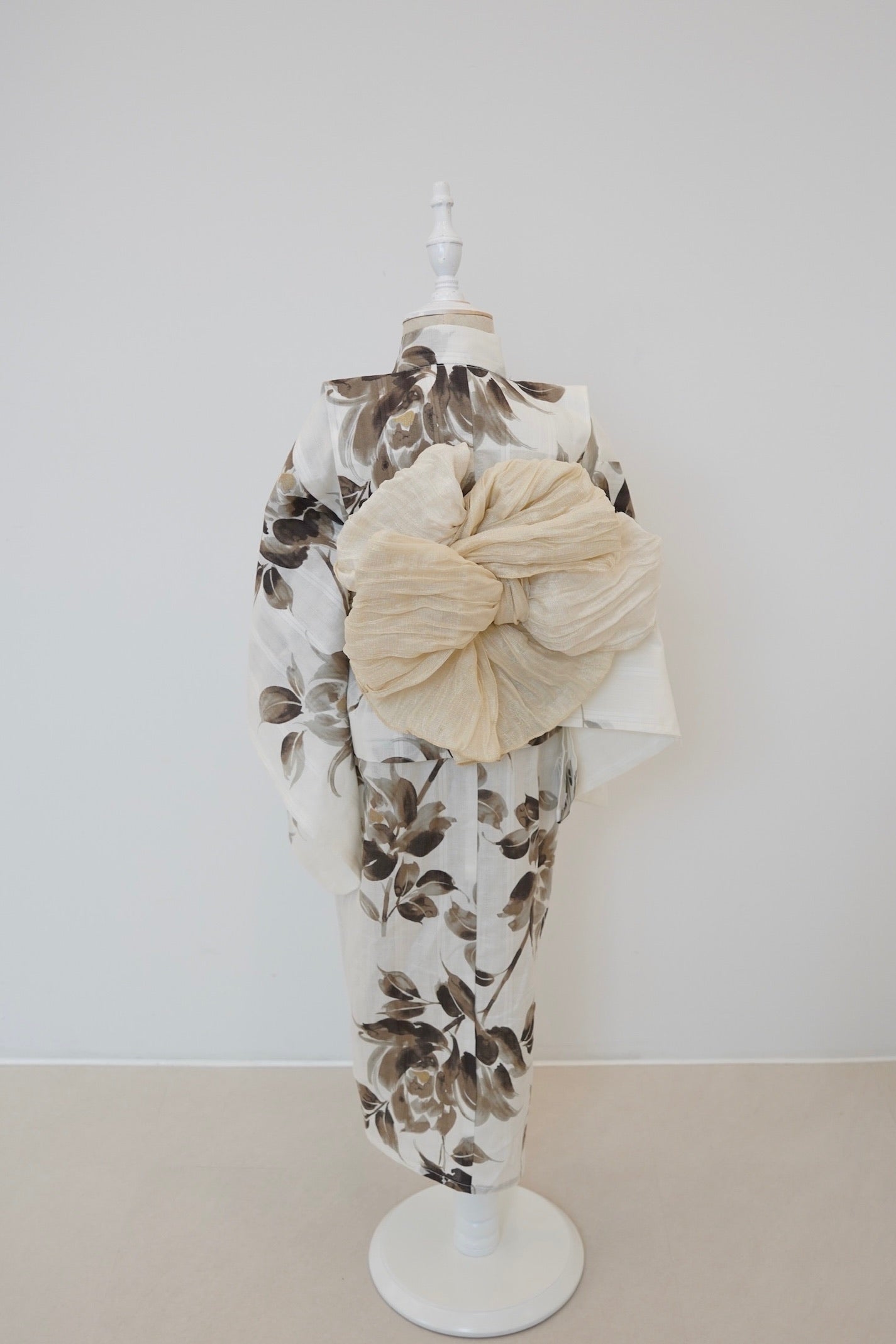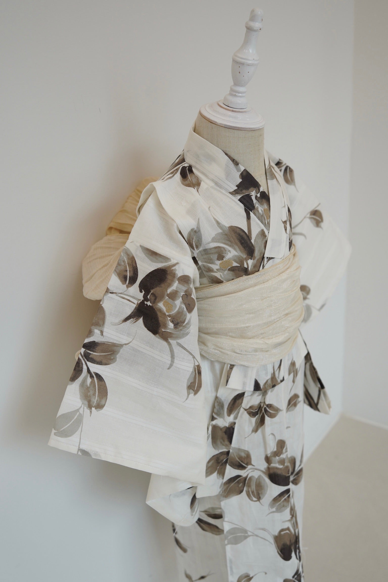白地に落ち着いたグレーの花模様が広がる浴衣は、ところどころにあしらわれたゴールドの蕾が、上品な輝きを添えます。