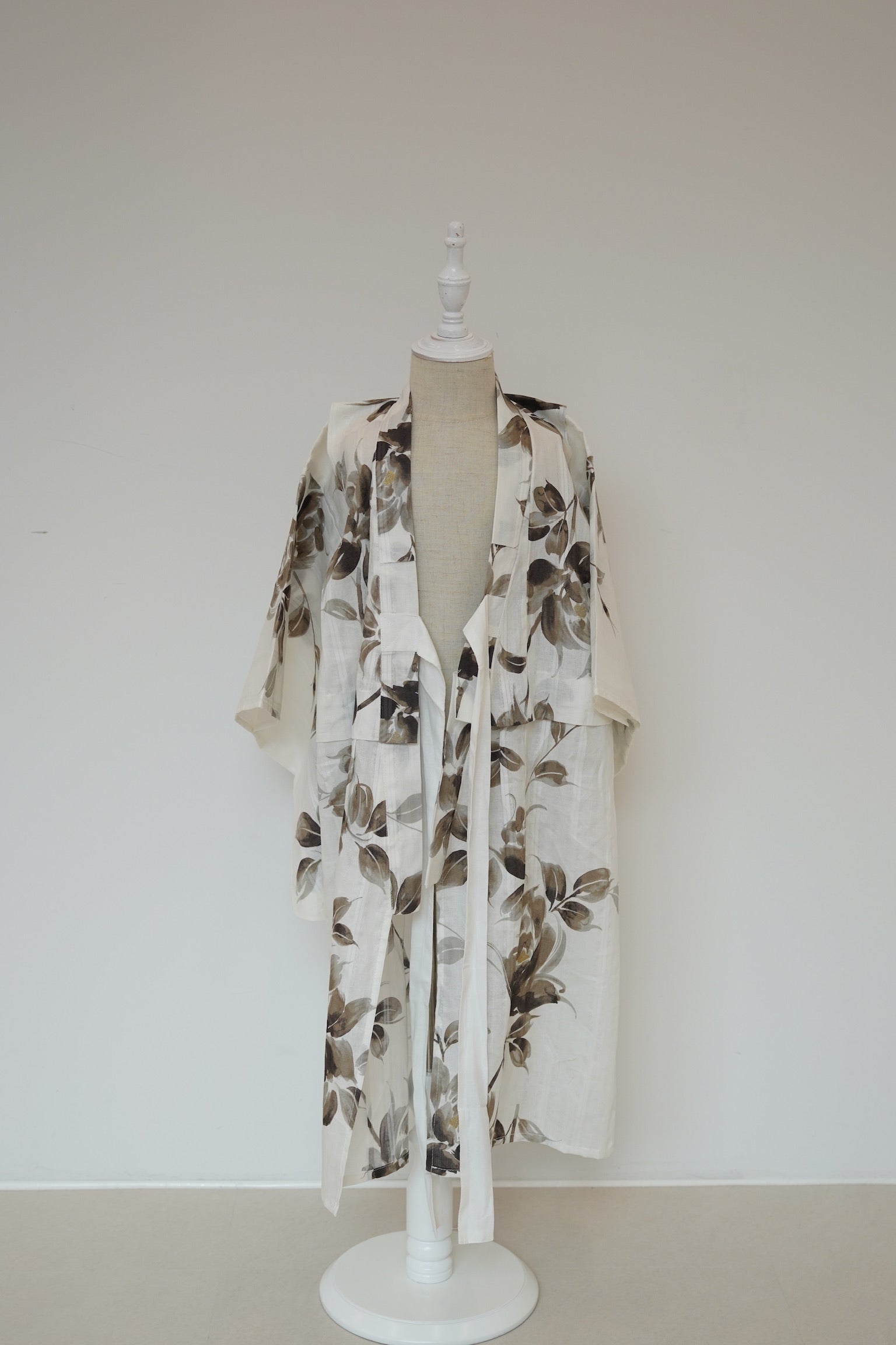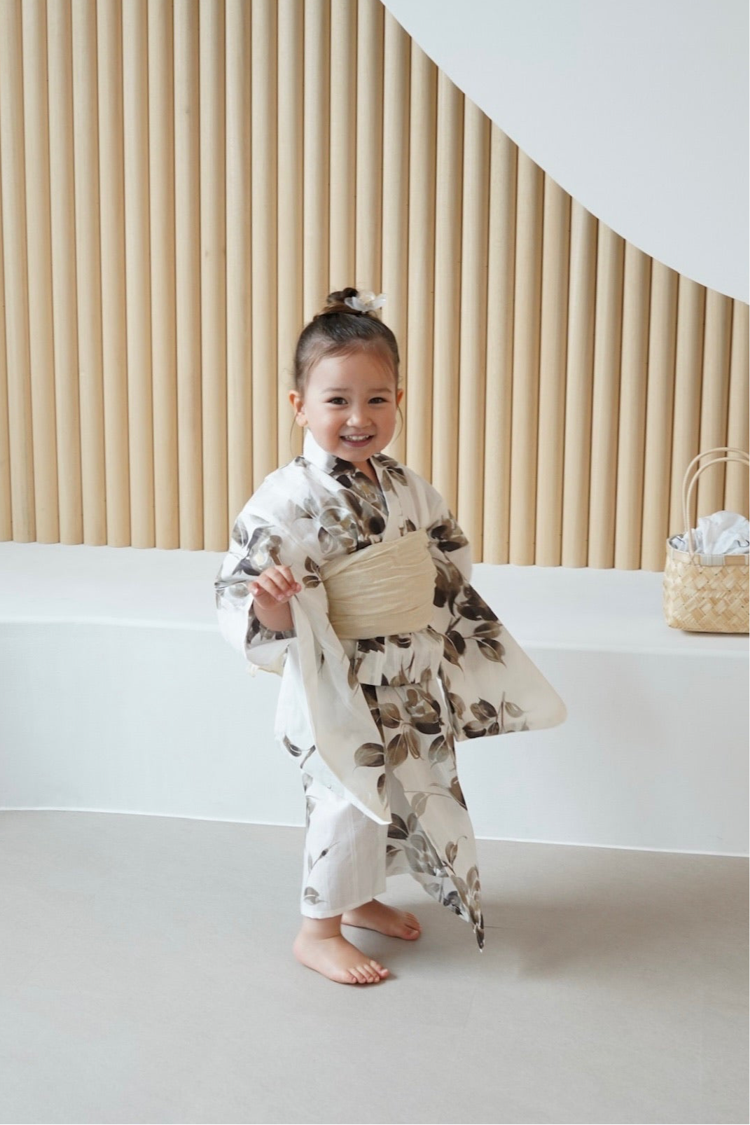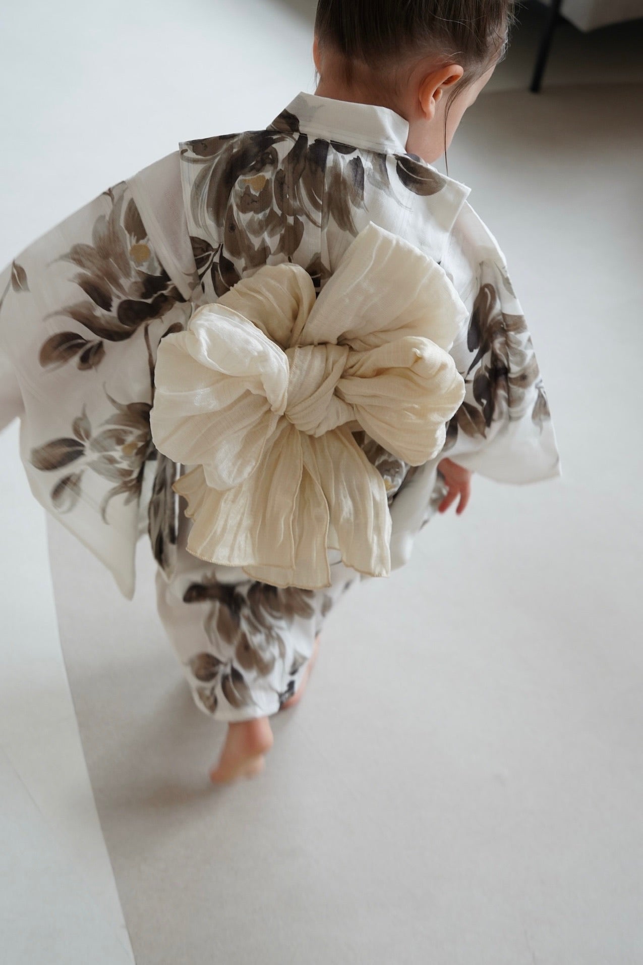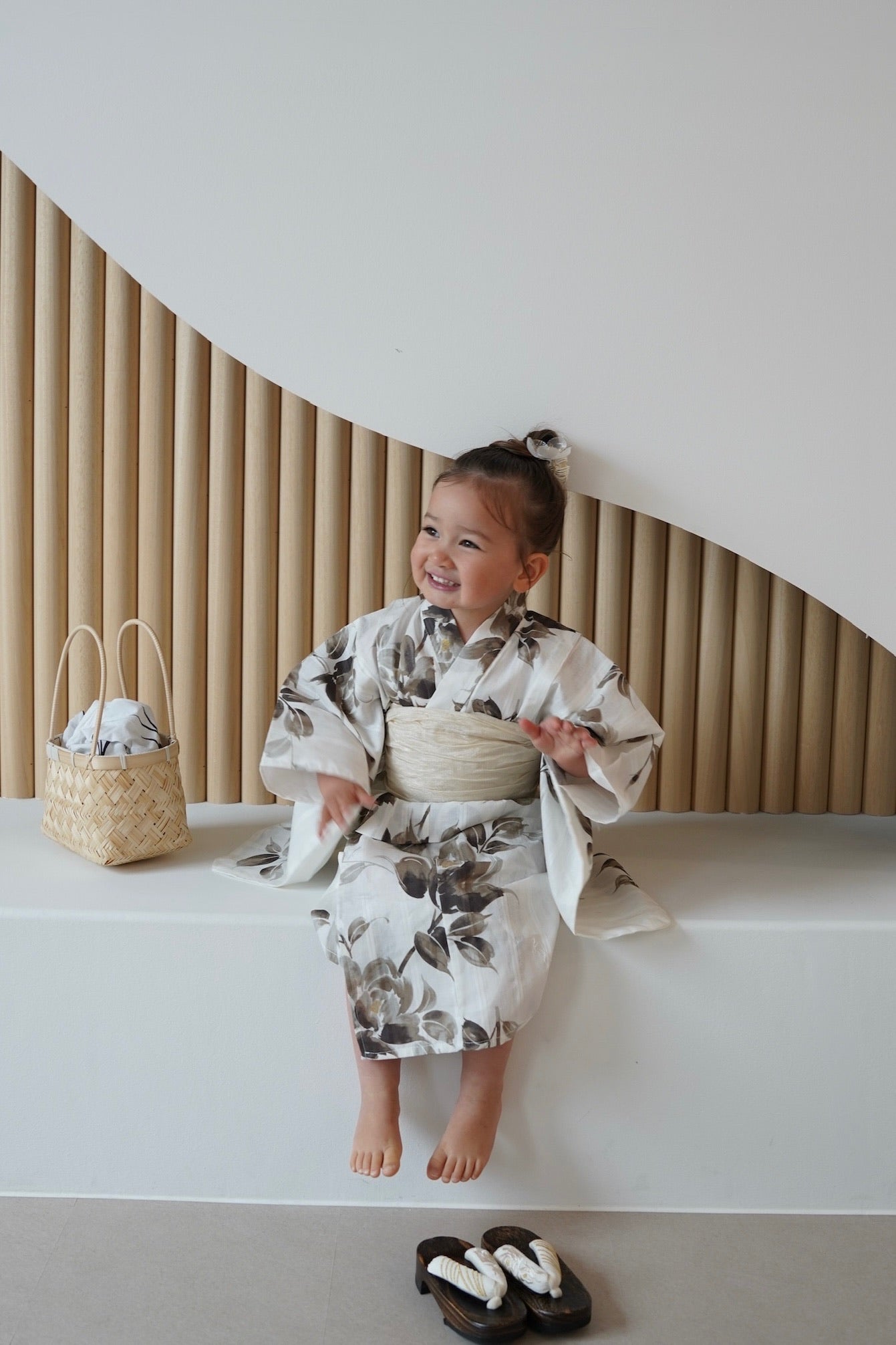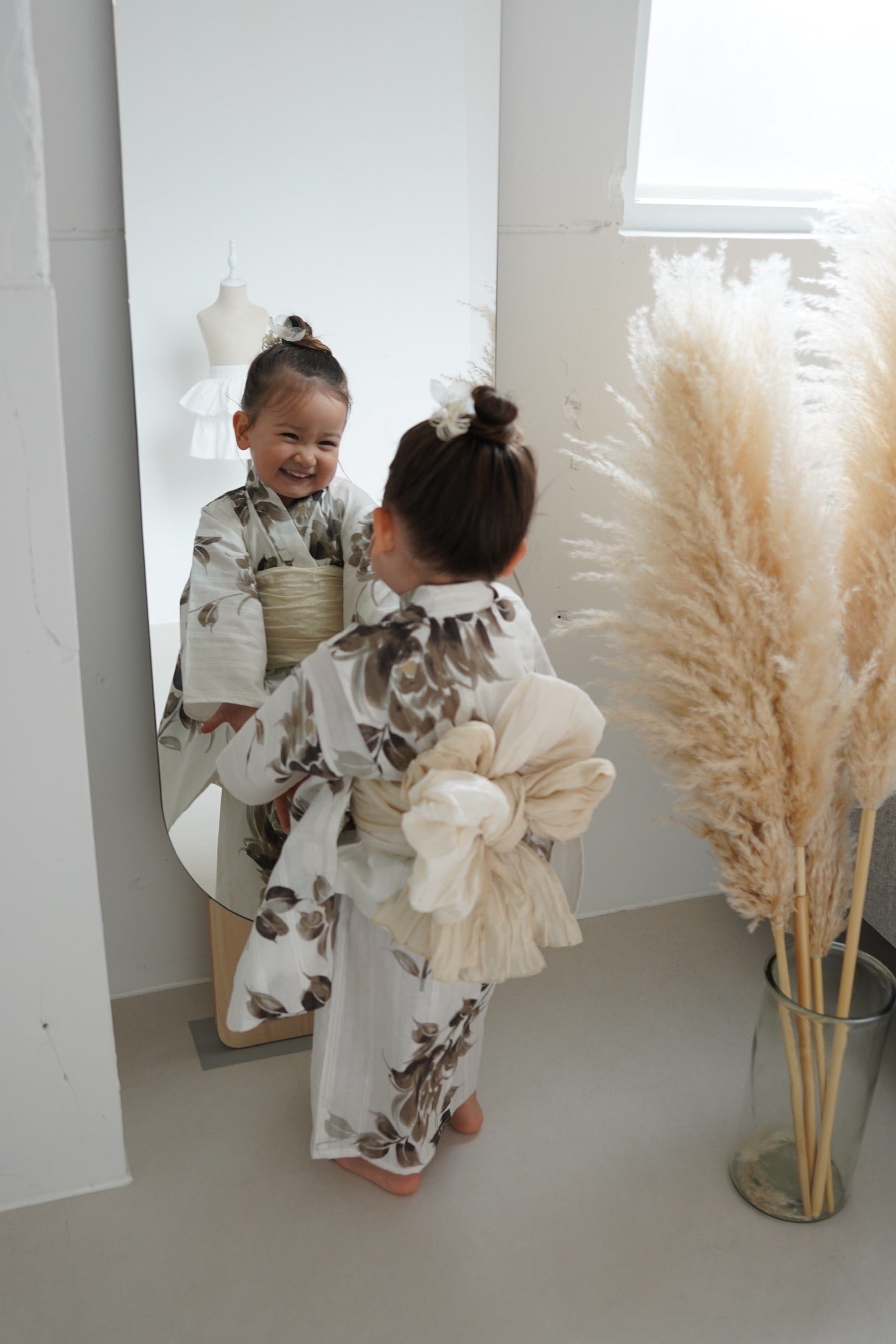 白地に落ち着いたグレーの花模様が広がる浴衣は、ところどころにあしらわれたゴールドの蕾が、上品な輝きを添えます。