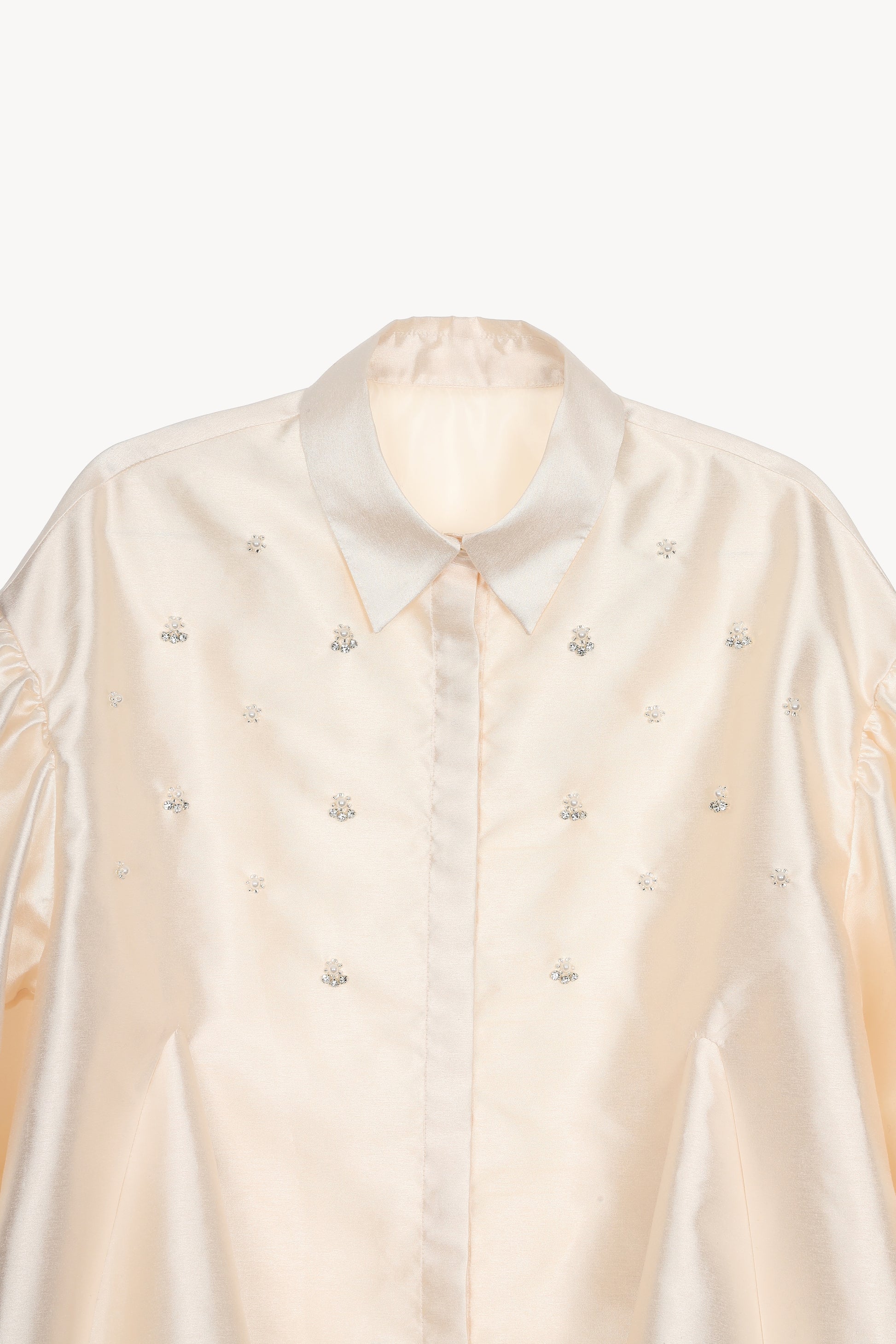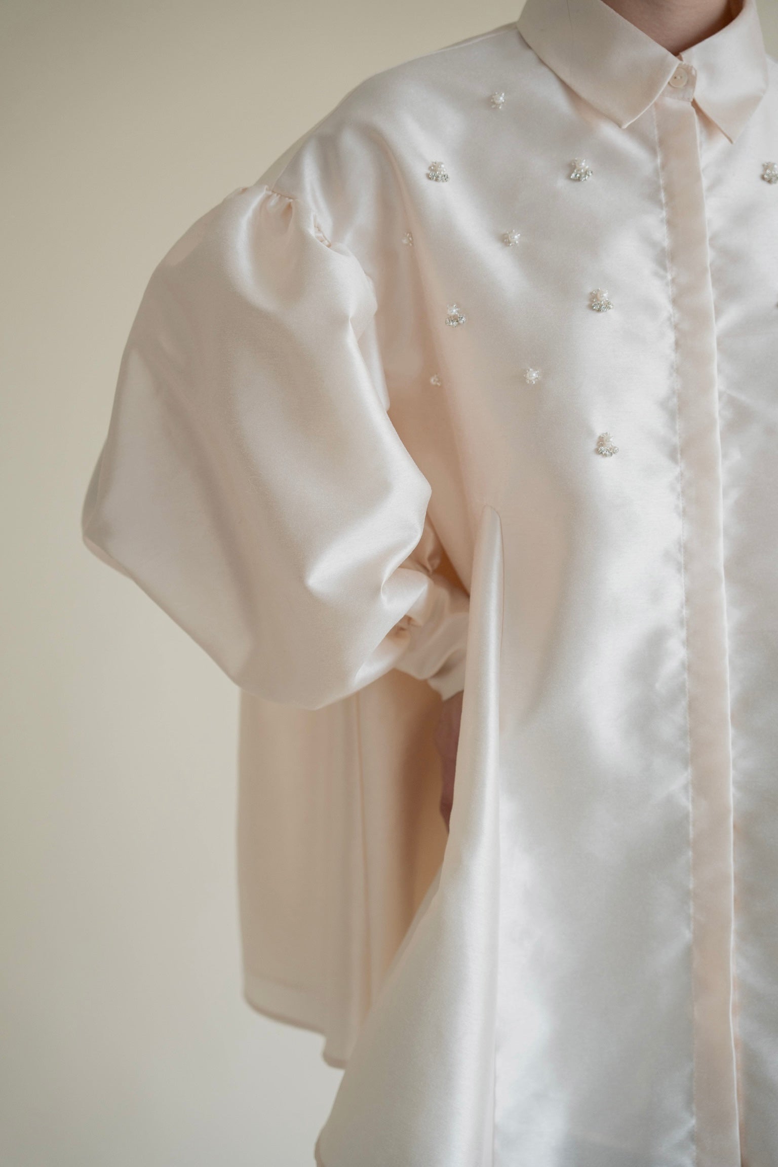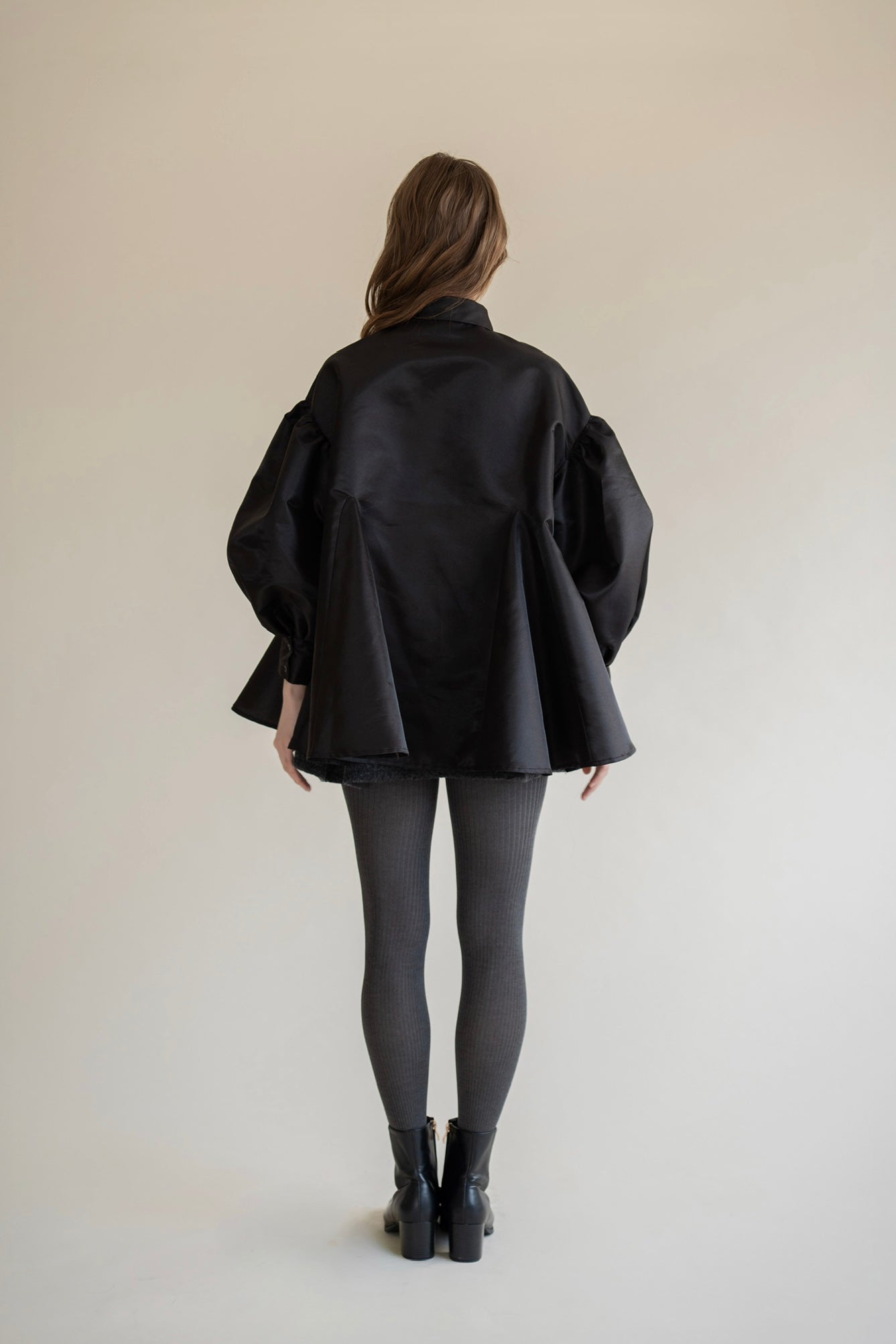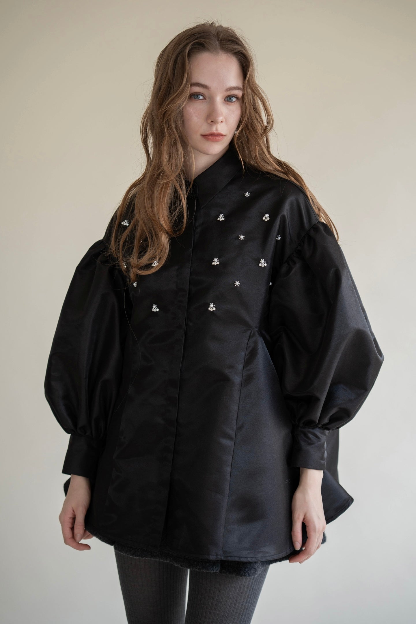 シャープな襟元が全体を引き締め、甘さを抑えた大人のバランスに。