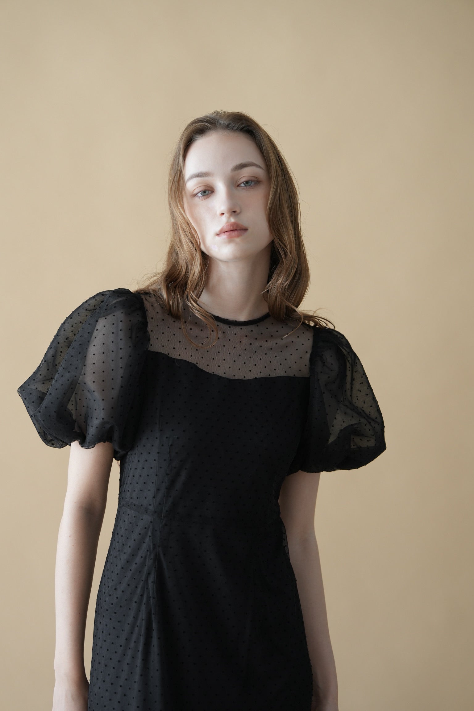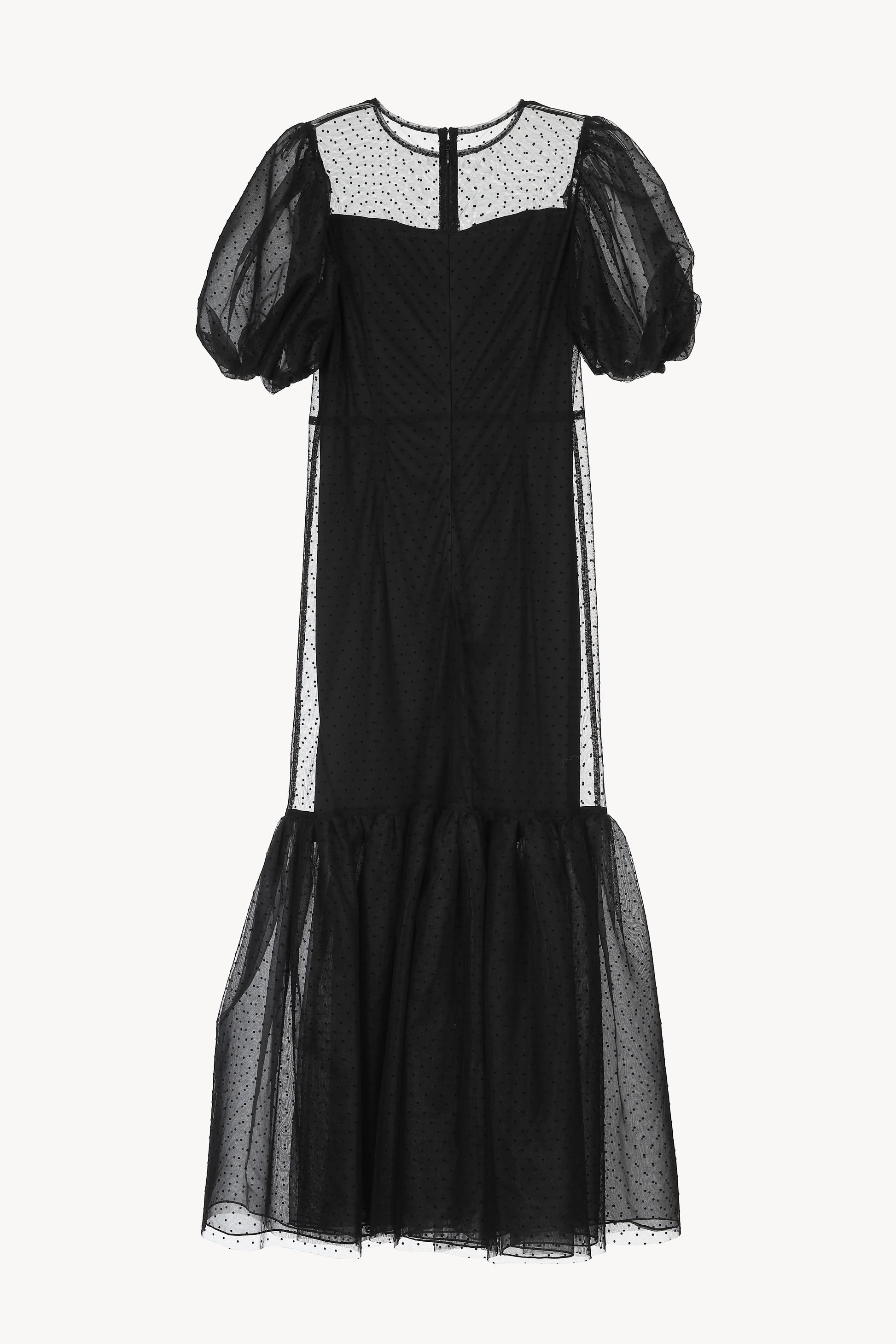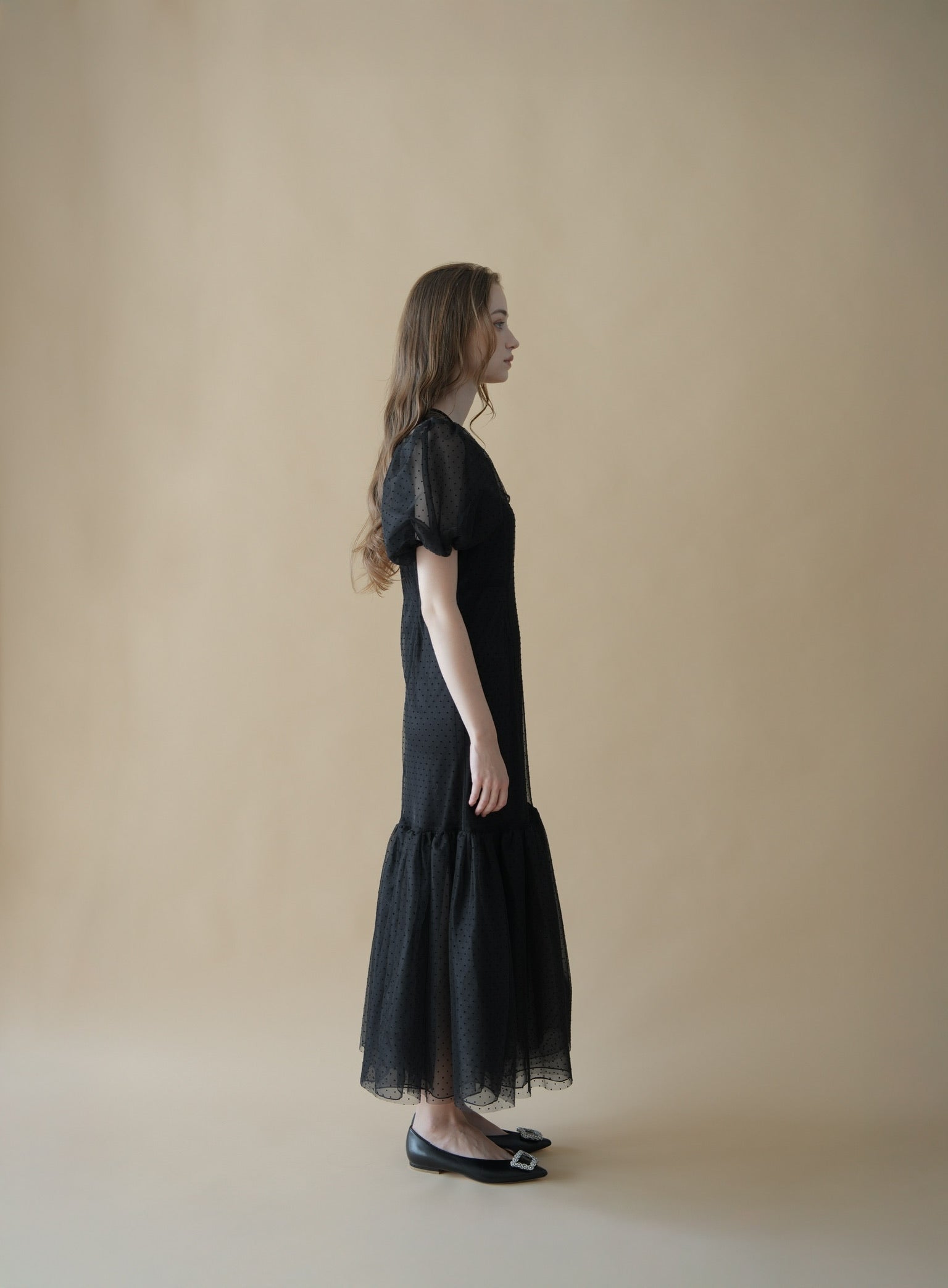 胸元から袖、裾にかけて重ねたチュール素材が、
