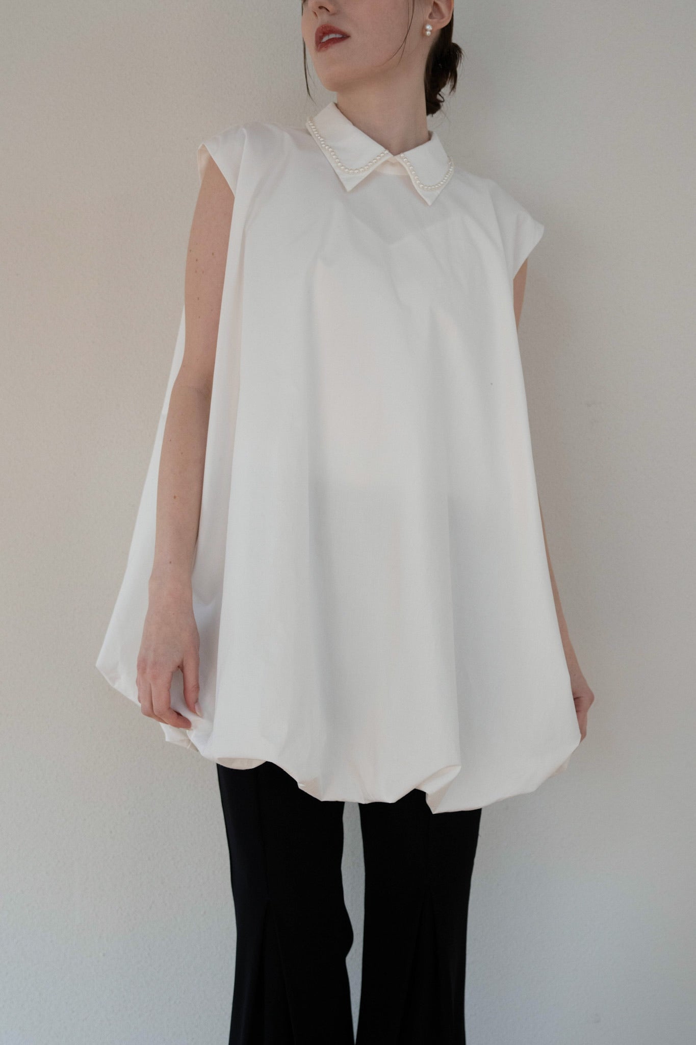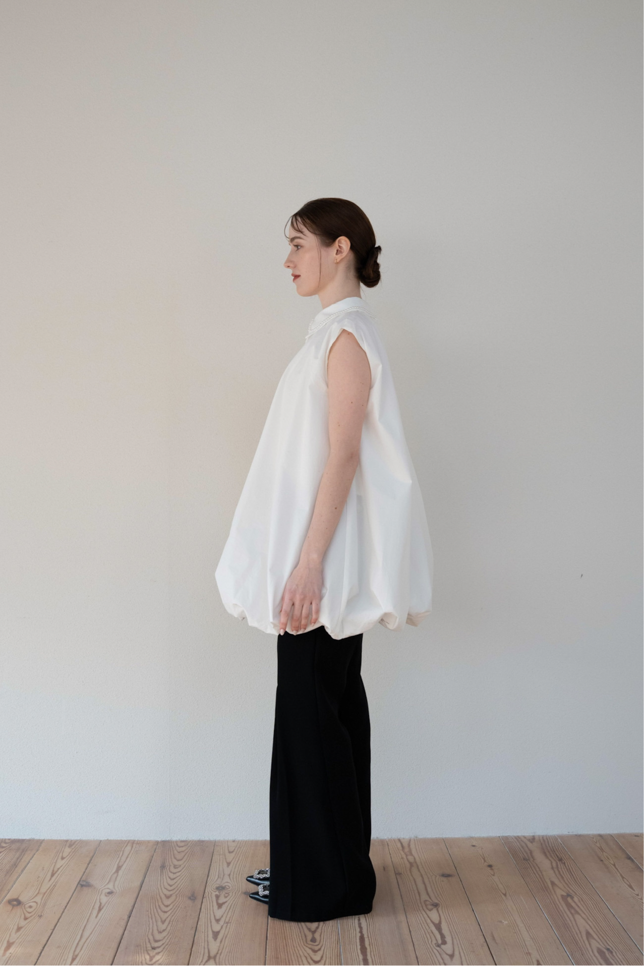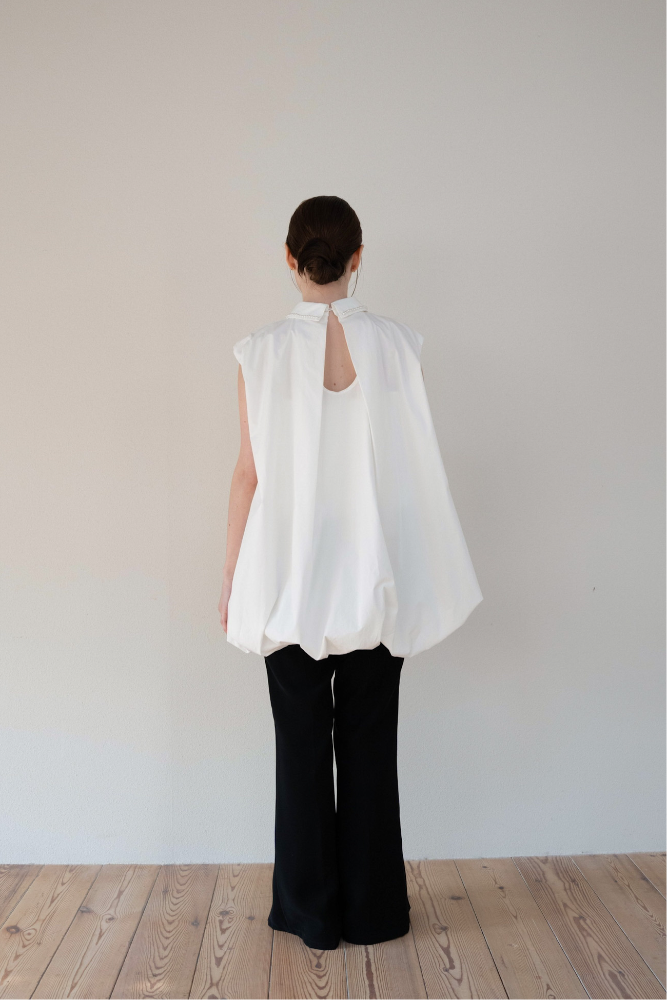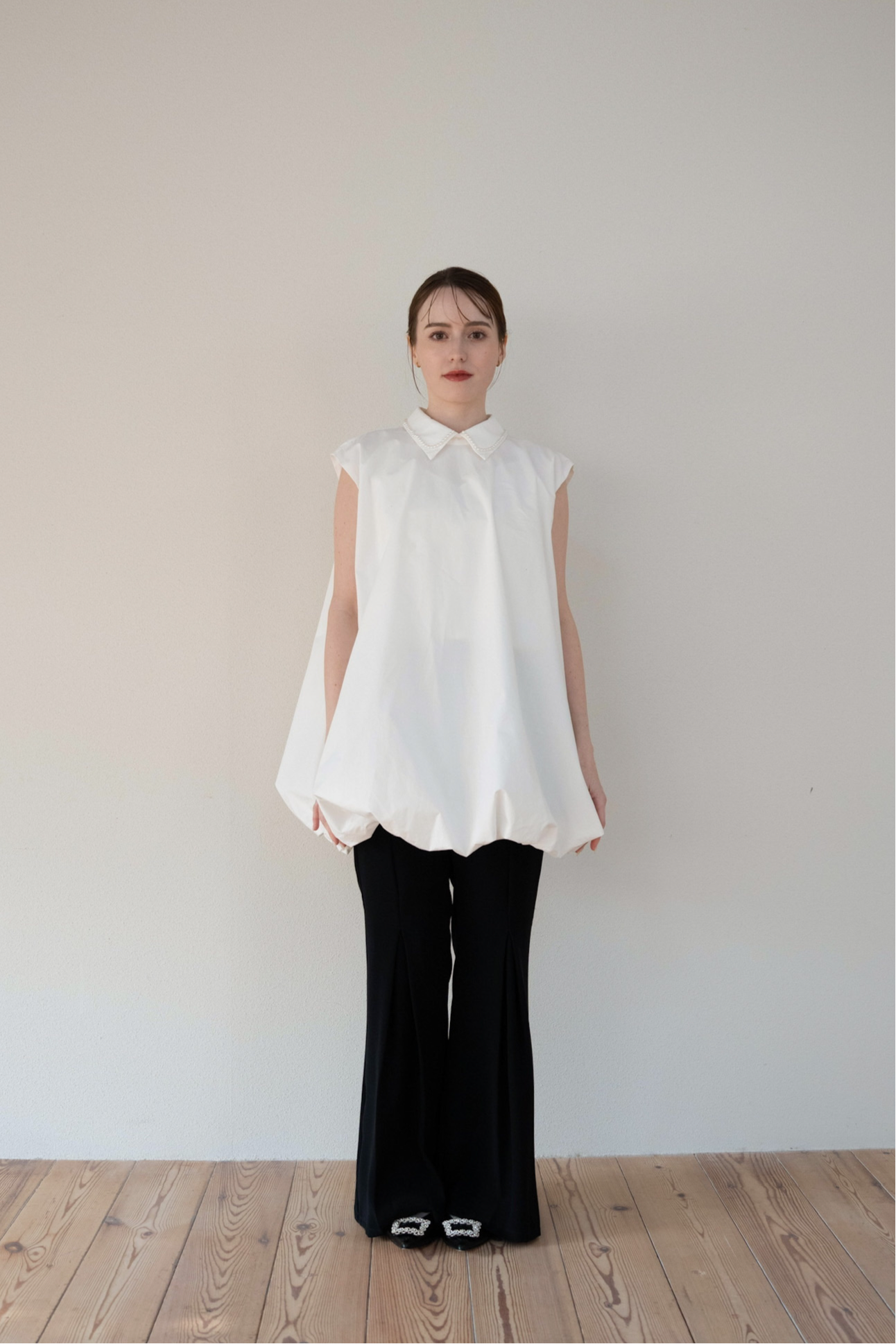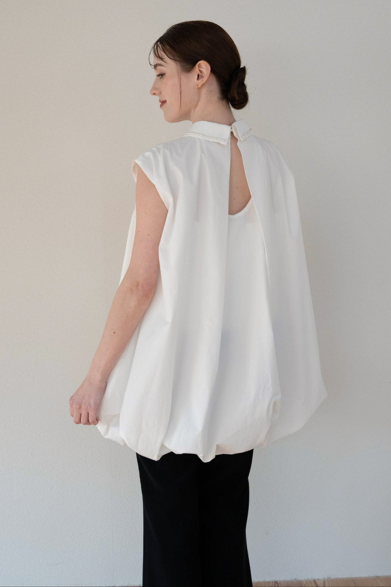 襟元にパールラインを施した一枚で着映えするバルーンシルエットのブラウス。