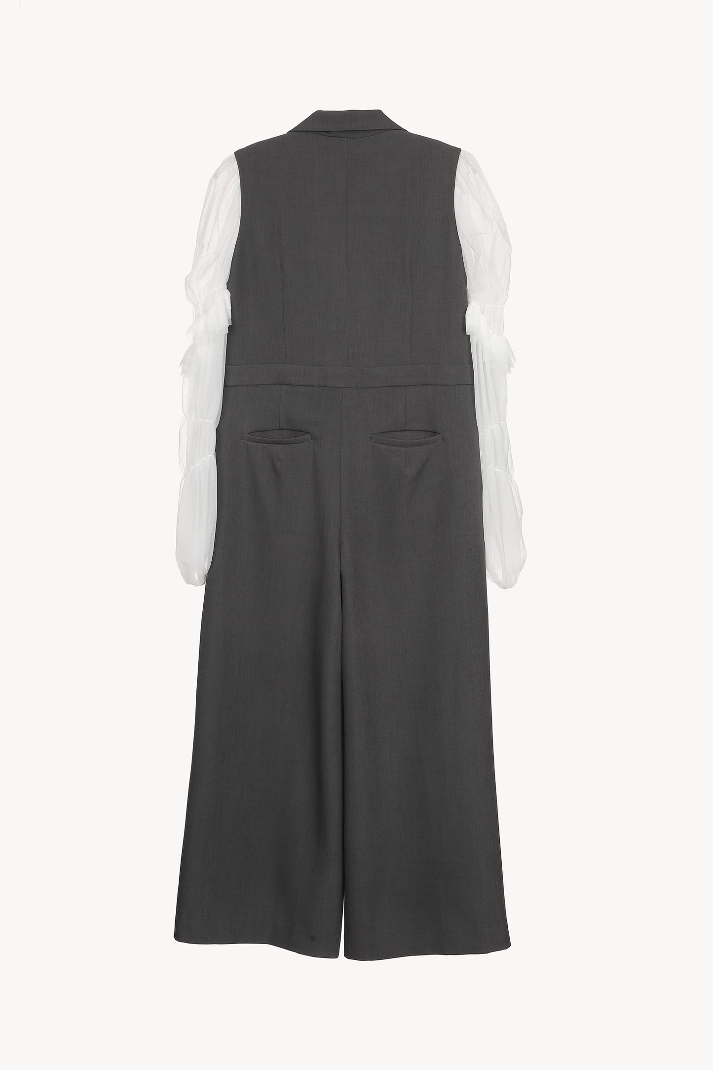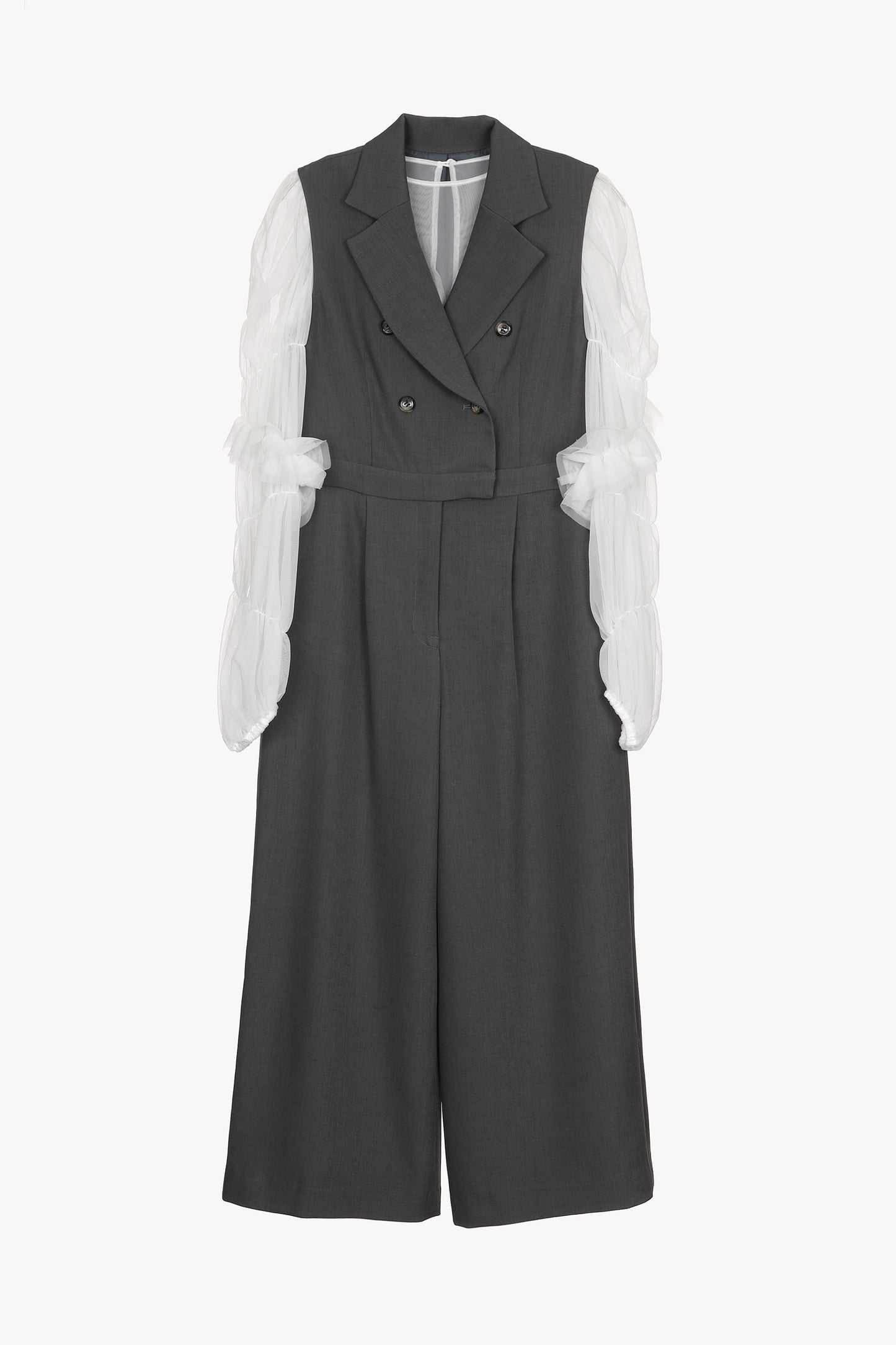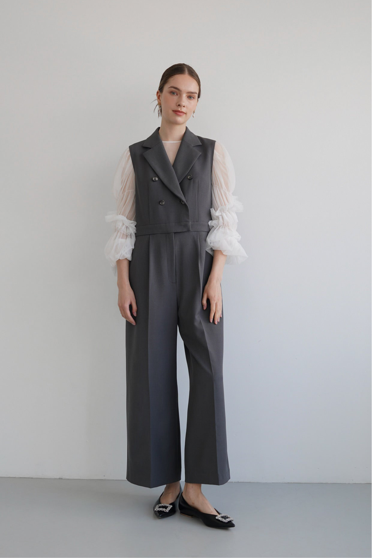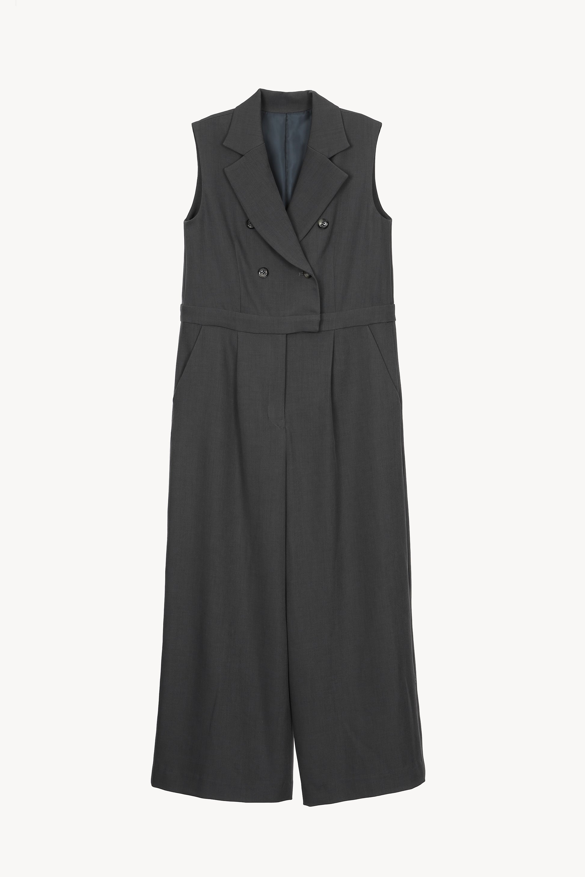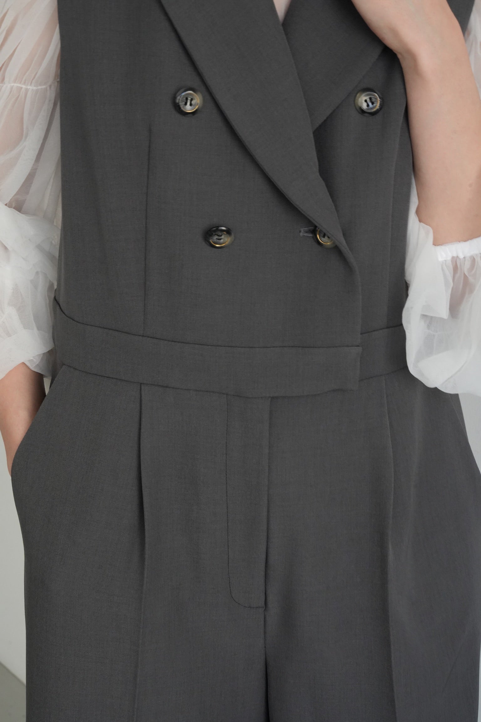 シックなダブルボタンのオールインワンと、