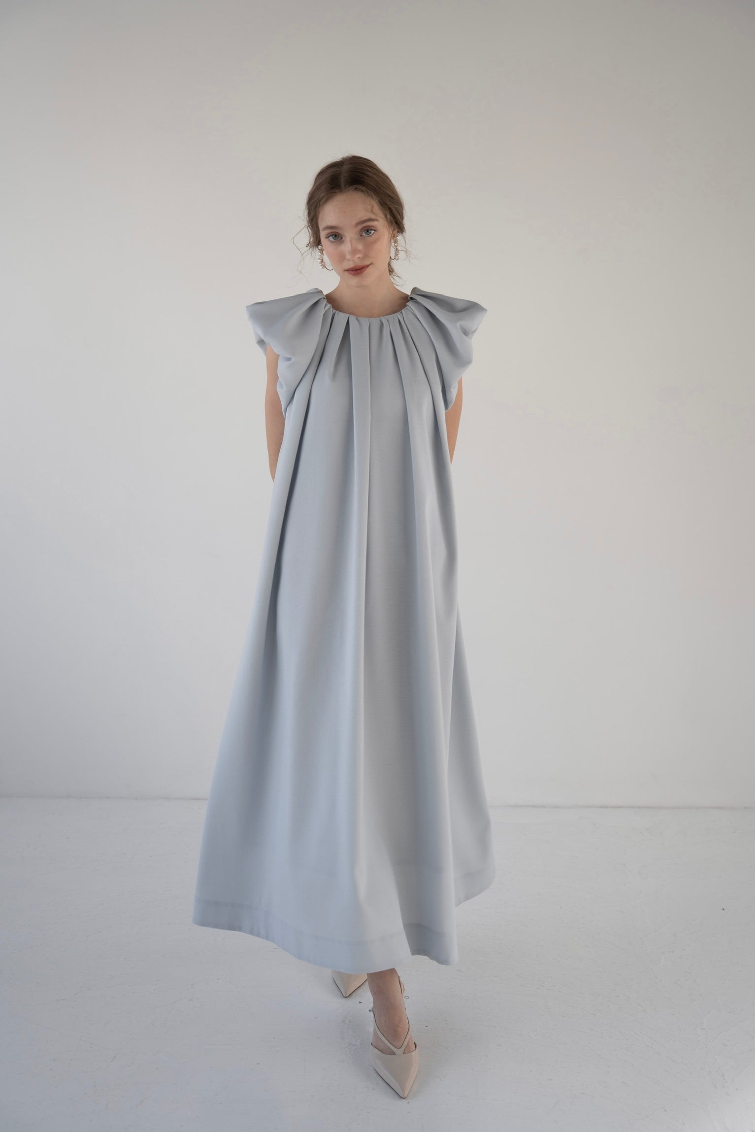 肩まわりに寄せたギャザーが自然な立体感を生み、