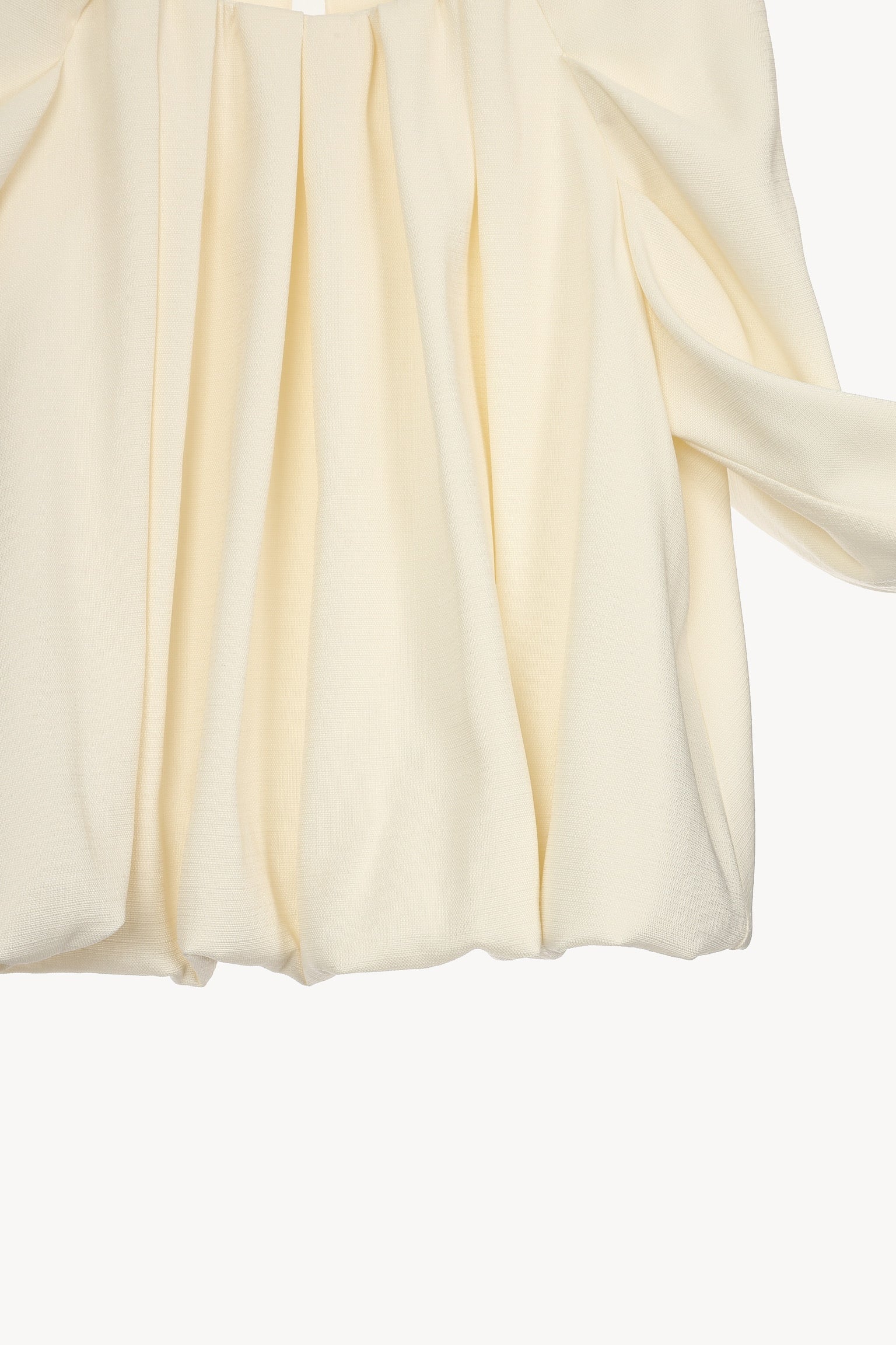 首元に寄せたギャザーが縦のラインを強調し、