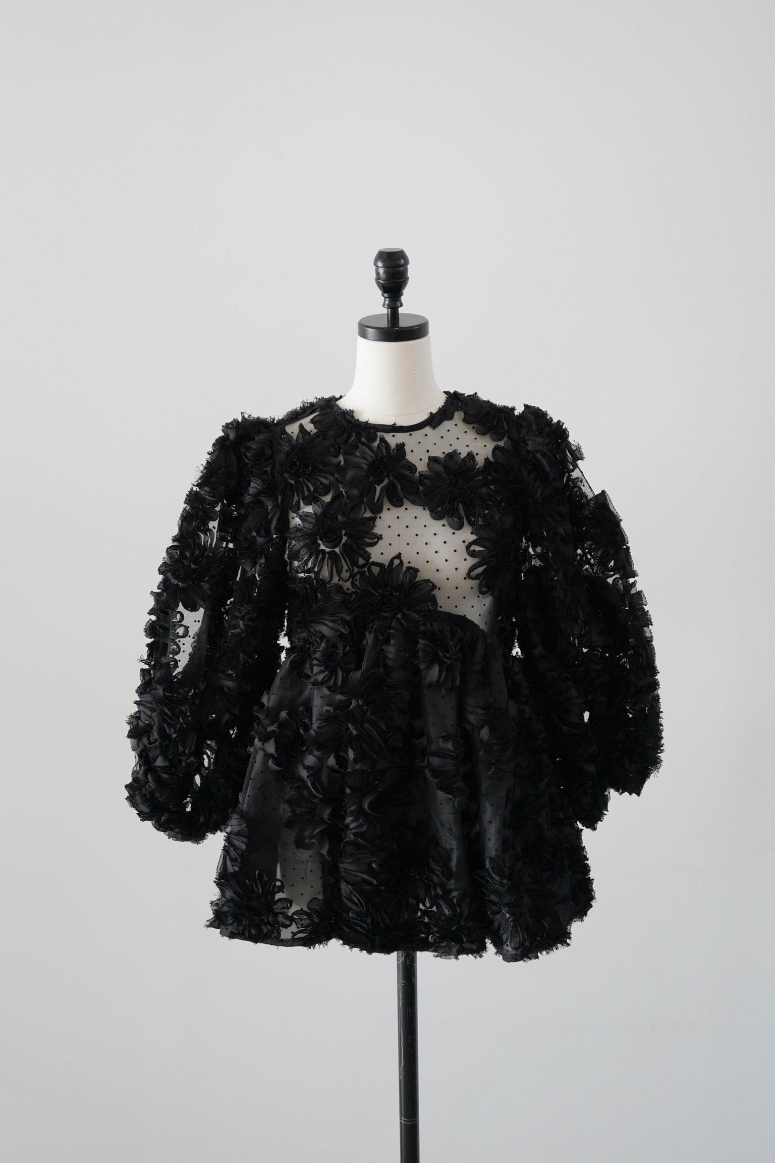 さりげないドット生地にフラワーモチーフが目を惹くペプラムトップス。