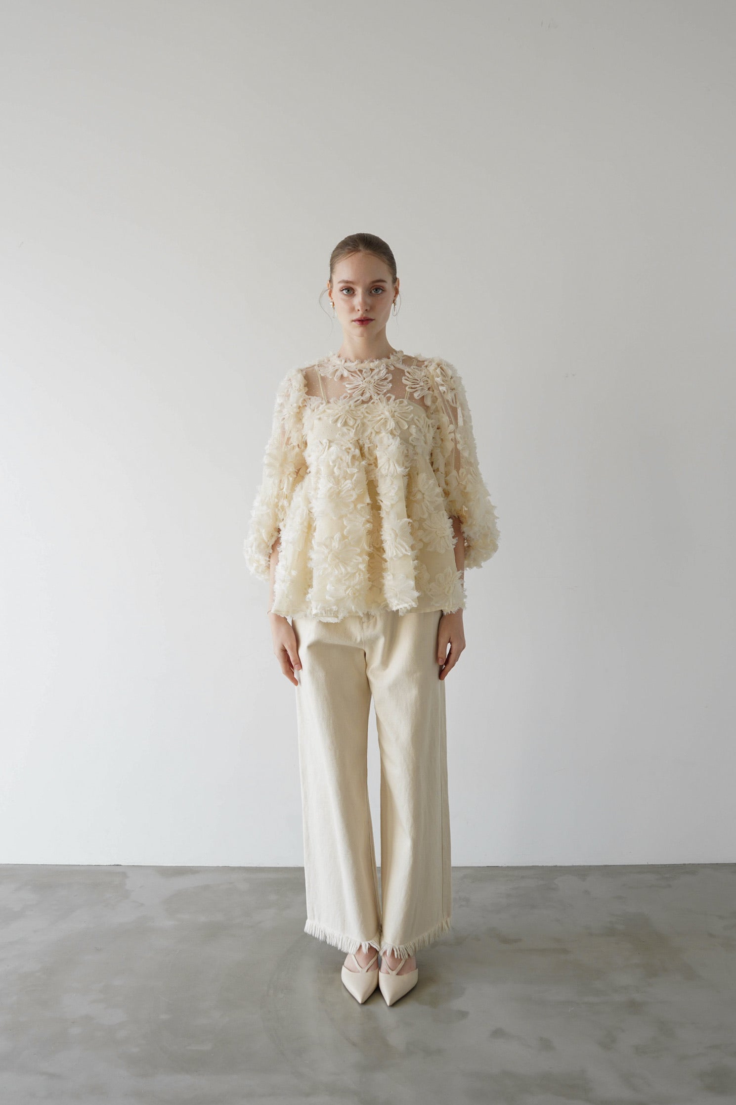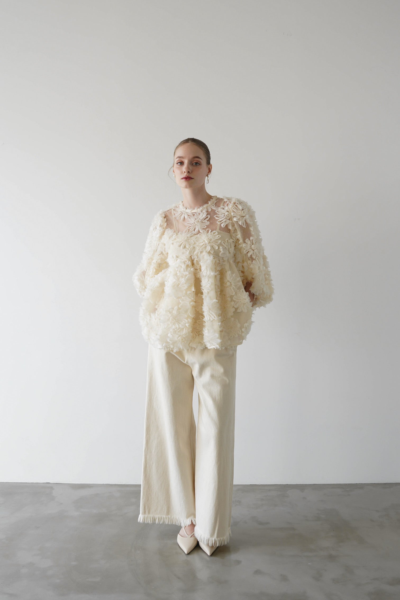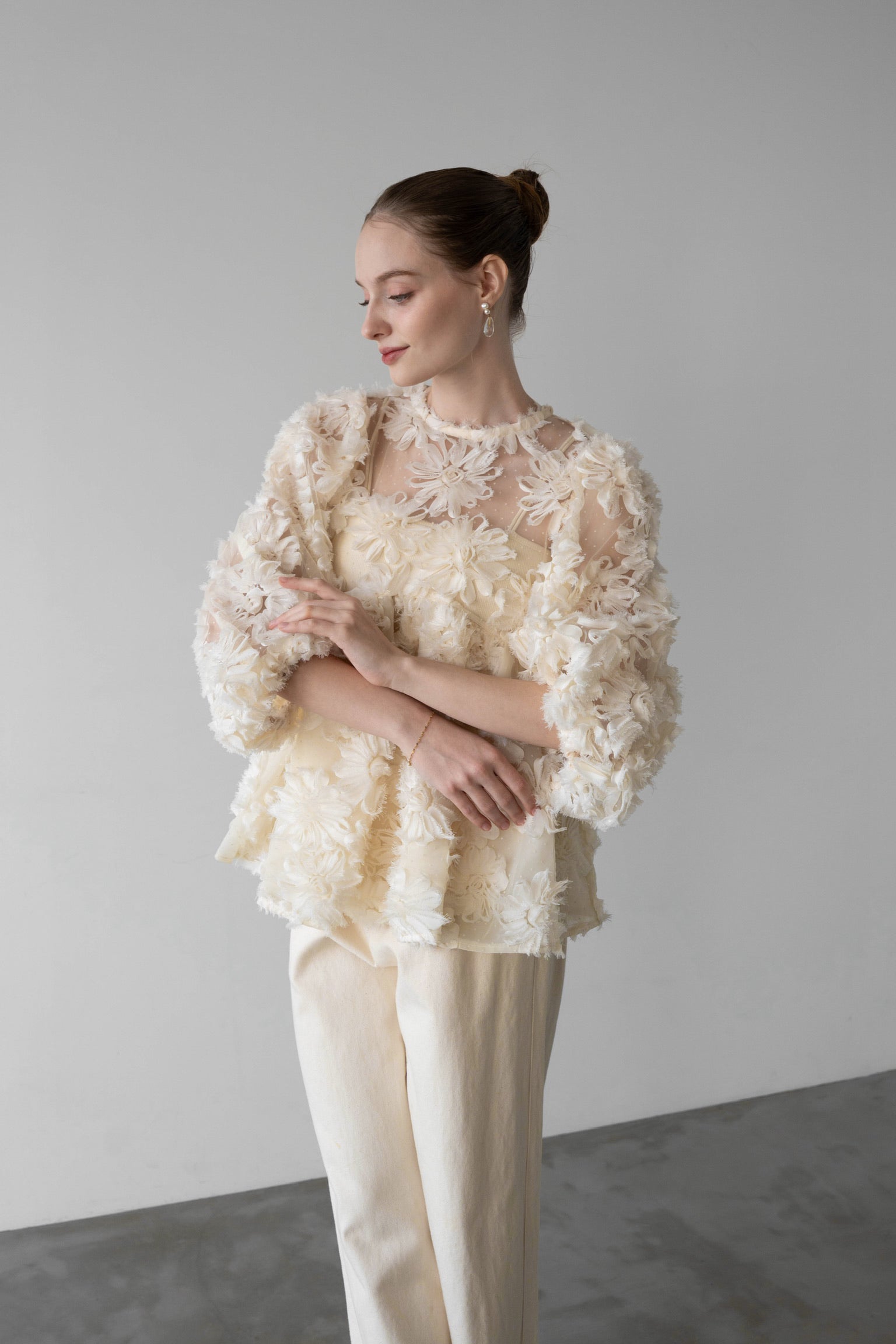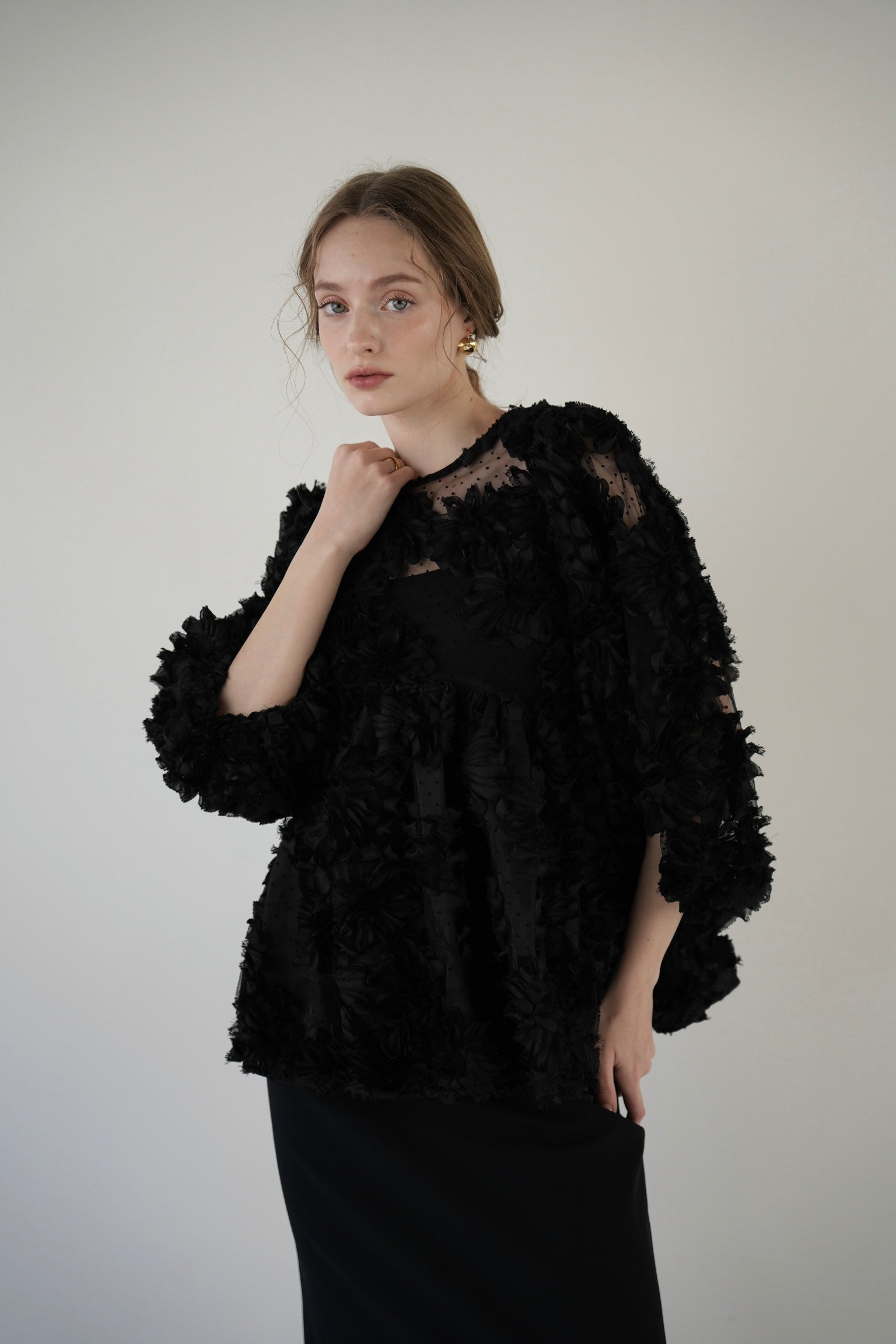 デザイン性と上品さが組み合わさり、唯一無二の華やかさを放つブラウス。