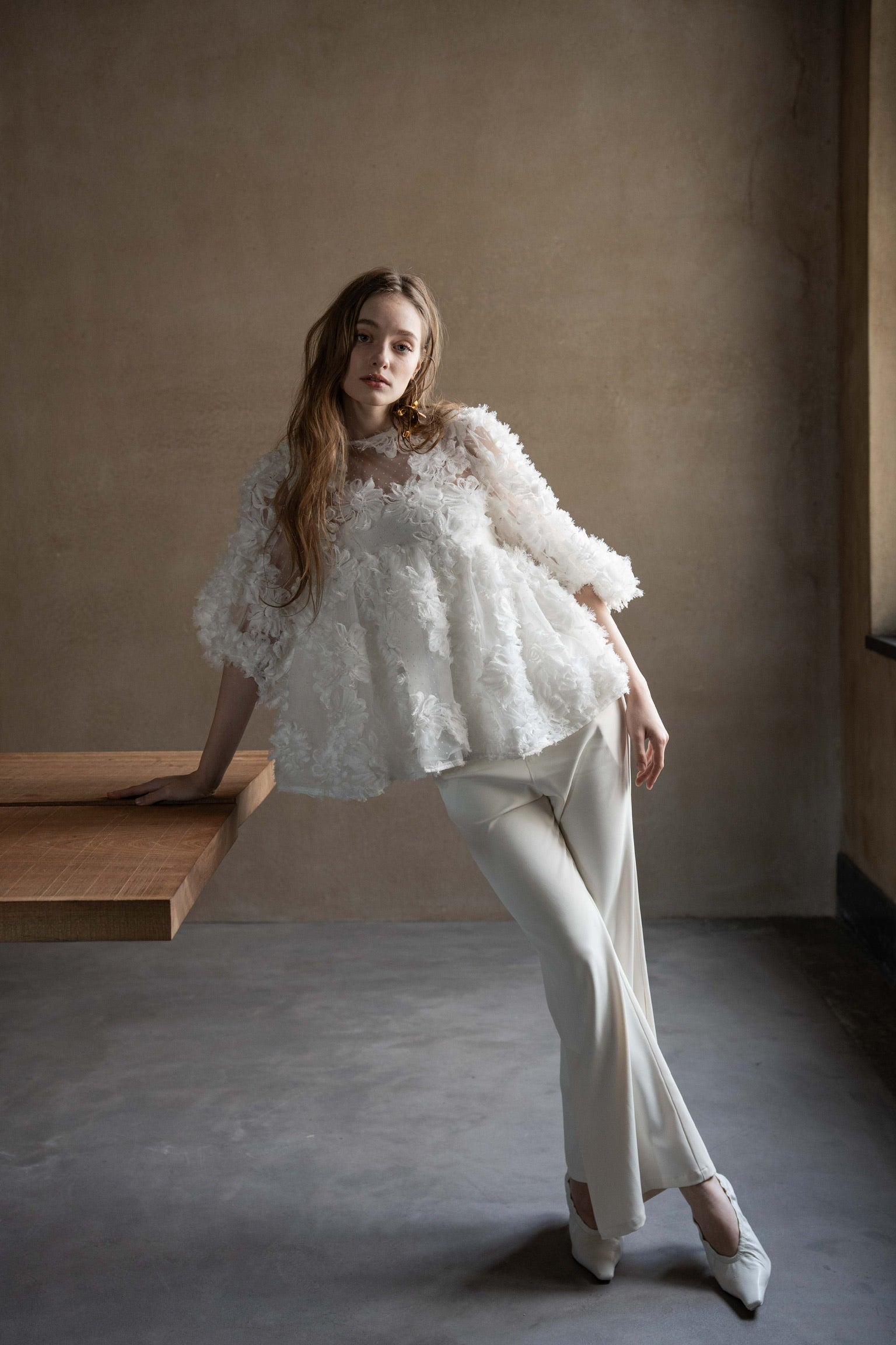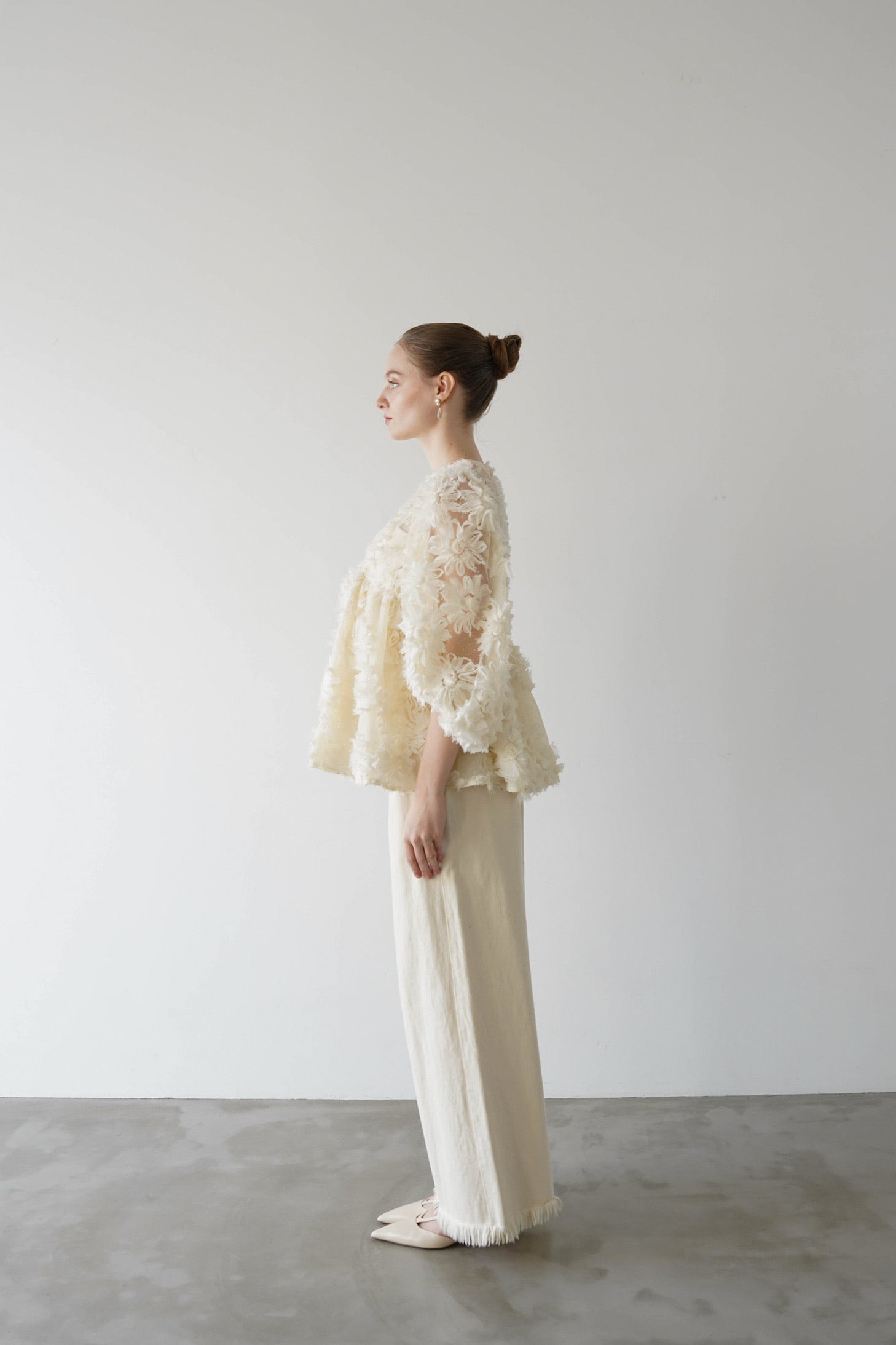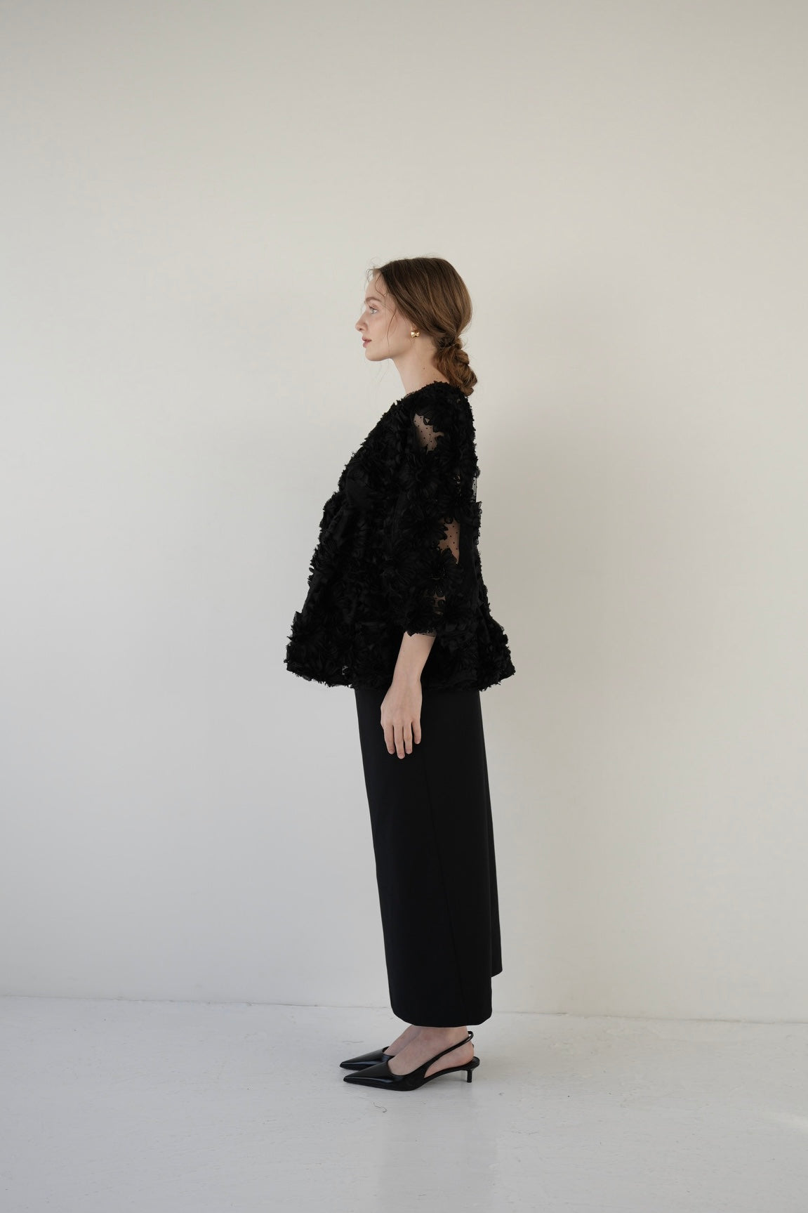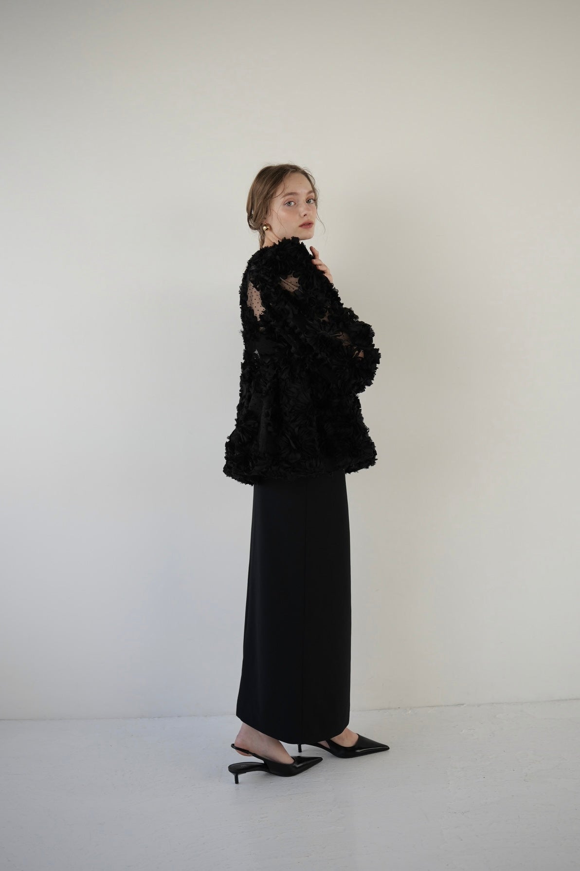 デザイン性と上品さが組み合わさり、唯一無二の華やかさを放つブラウス。