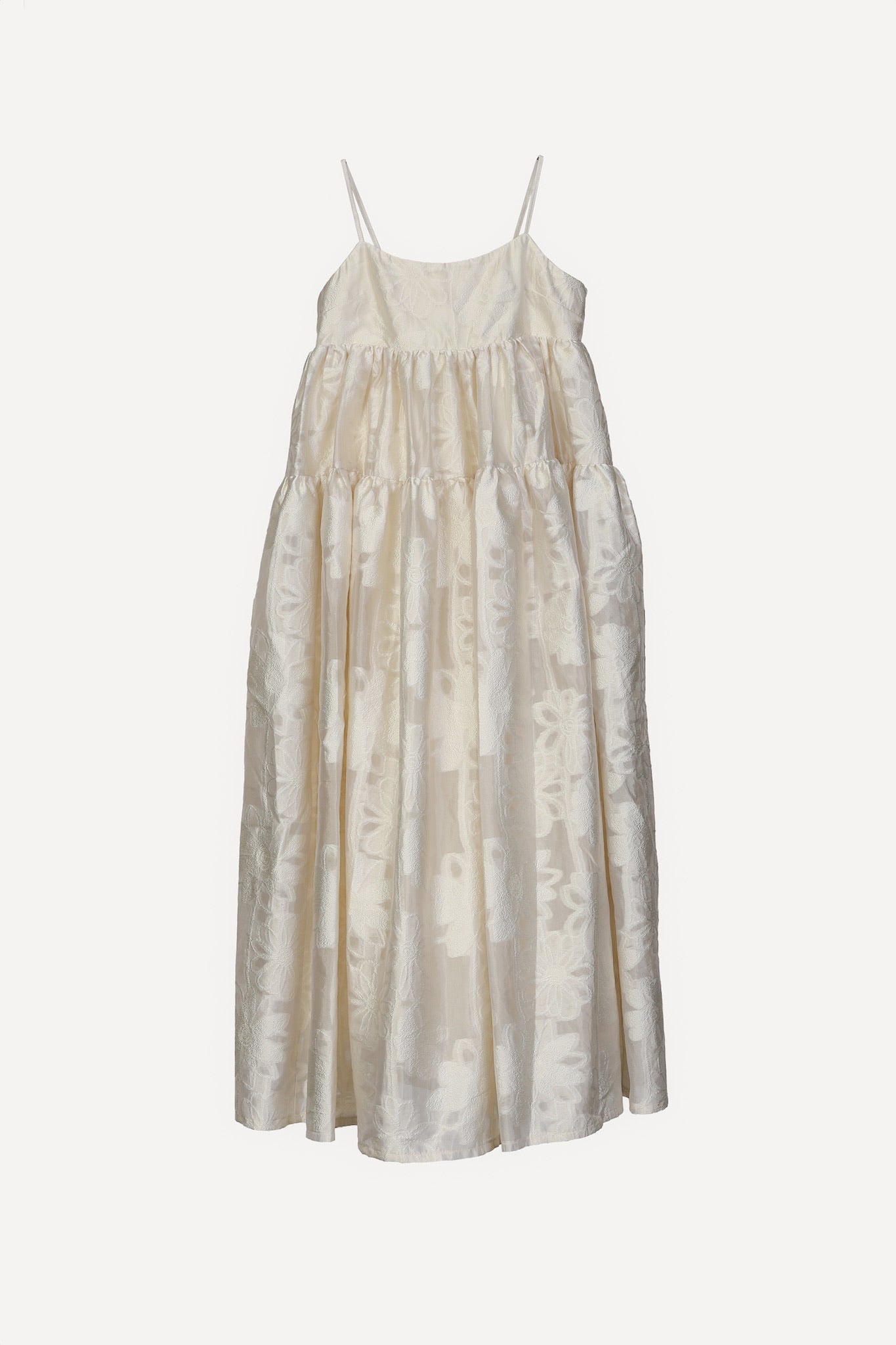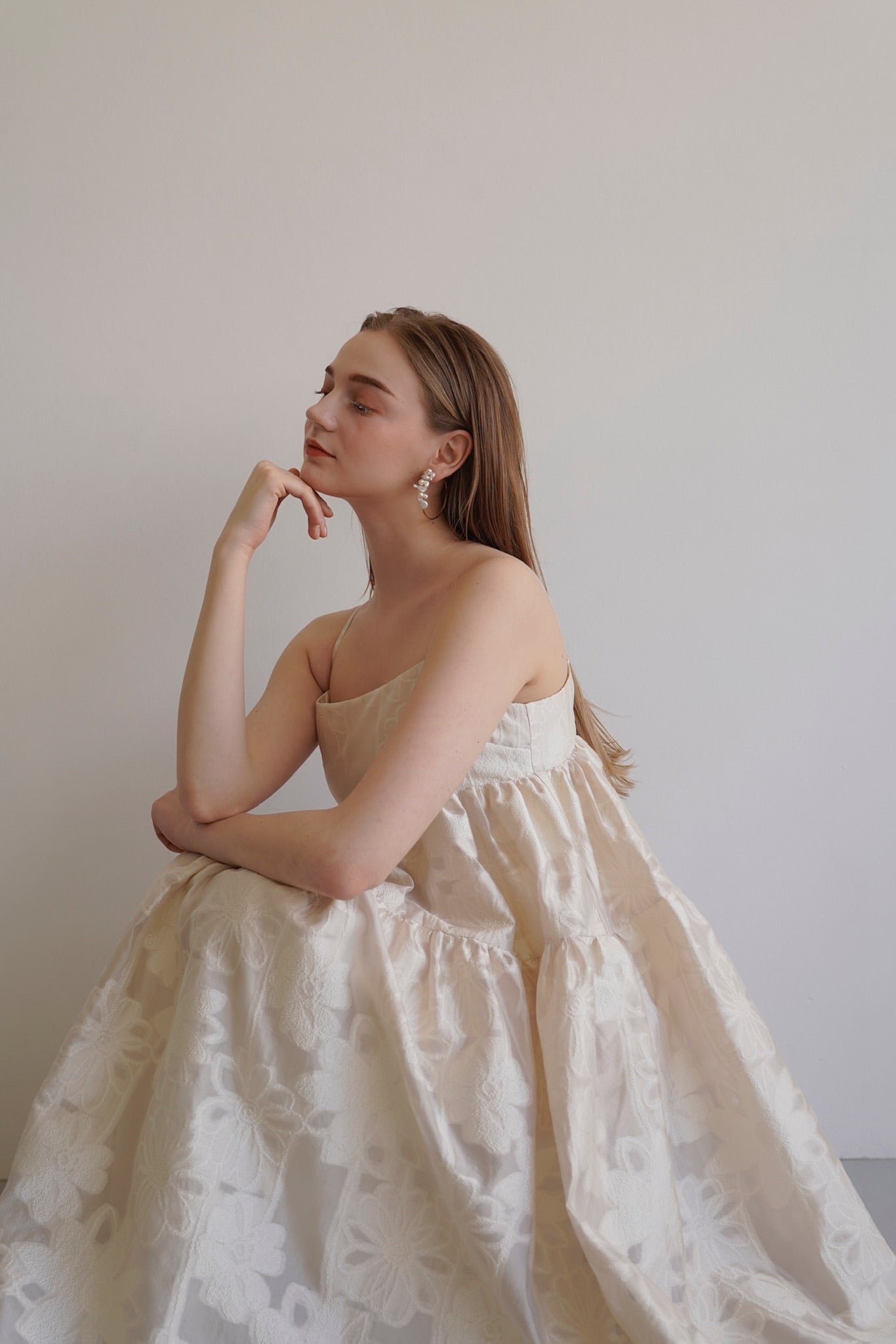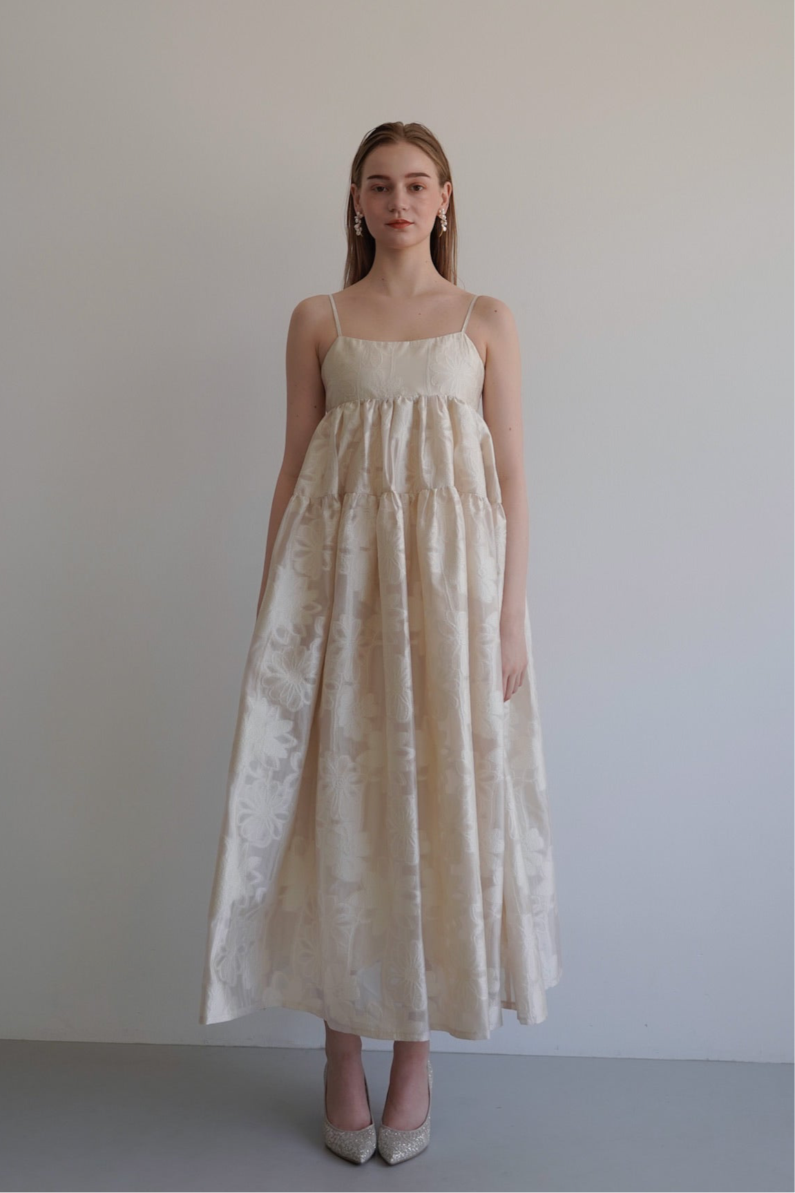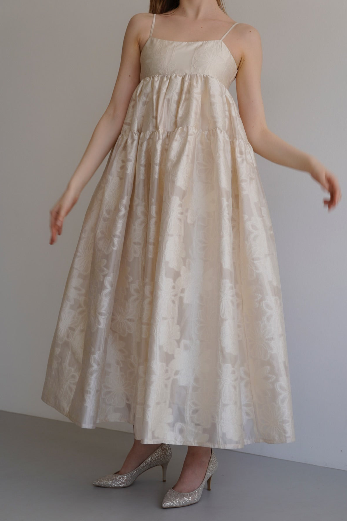 広がりすぎないフレアシルエットに華奢なストラップが特徴のアイテム。