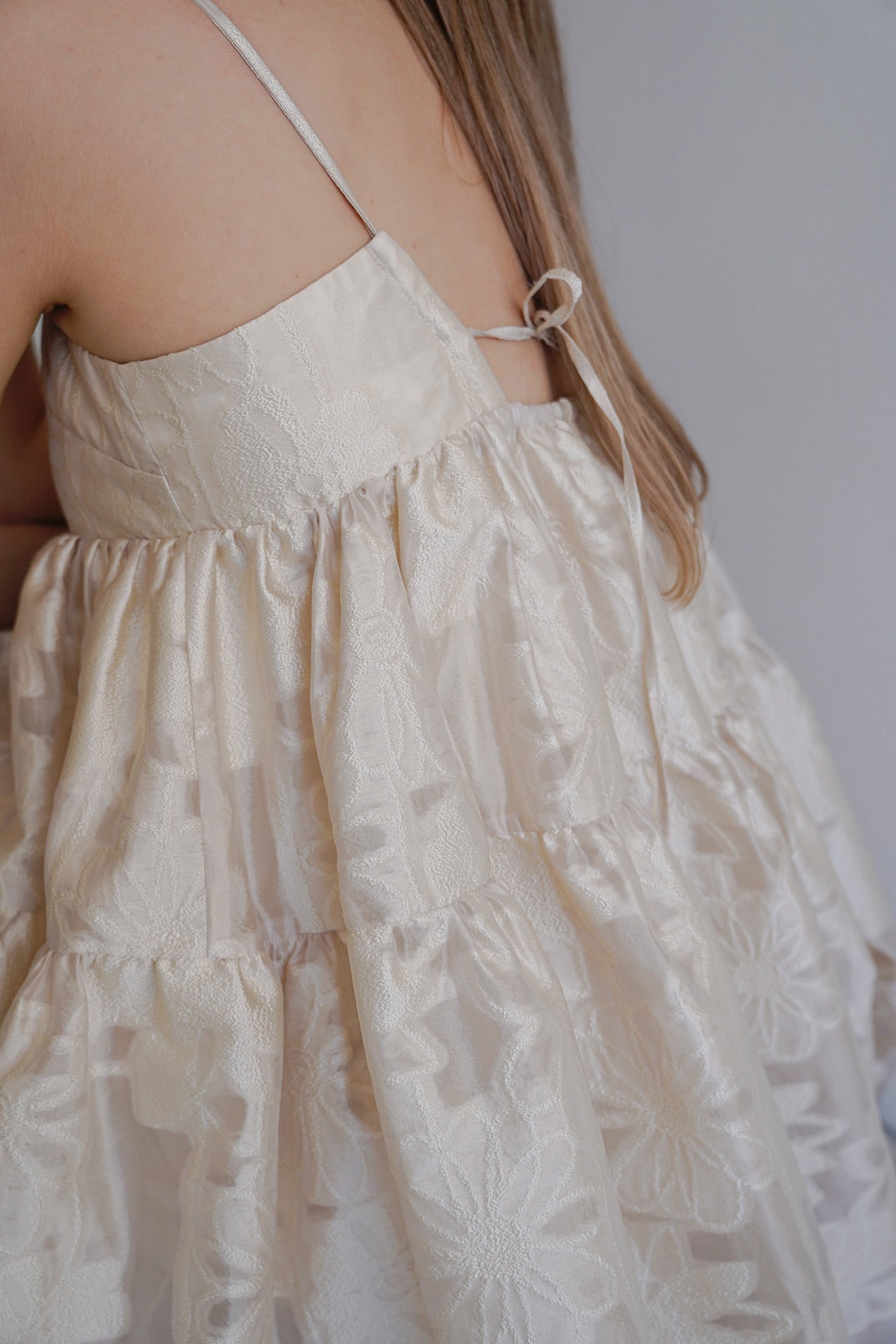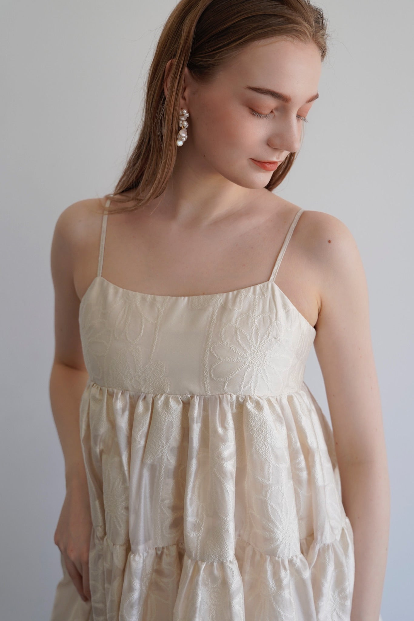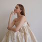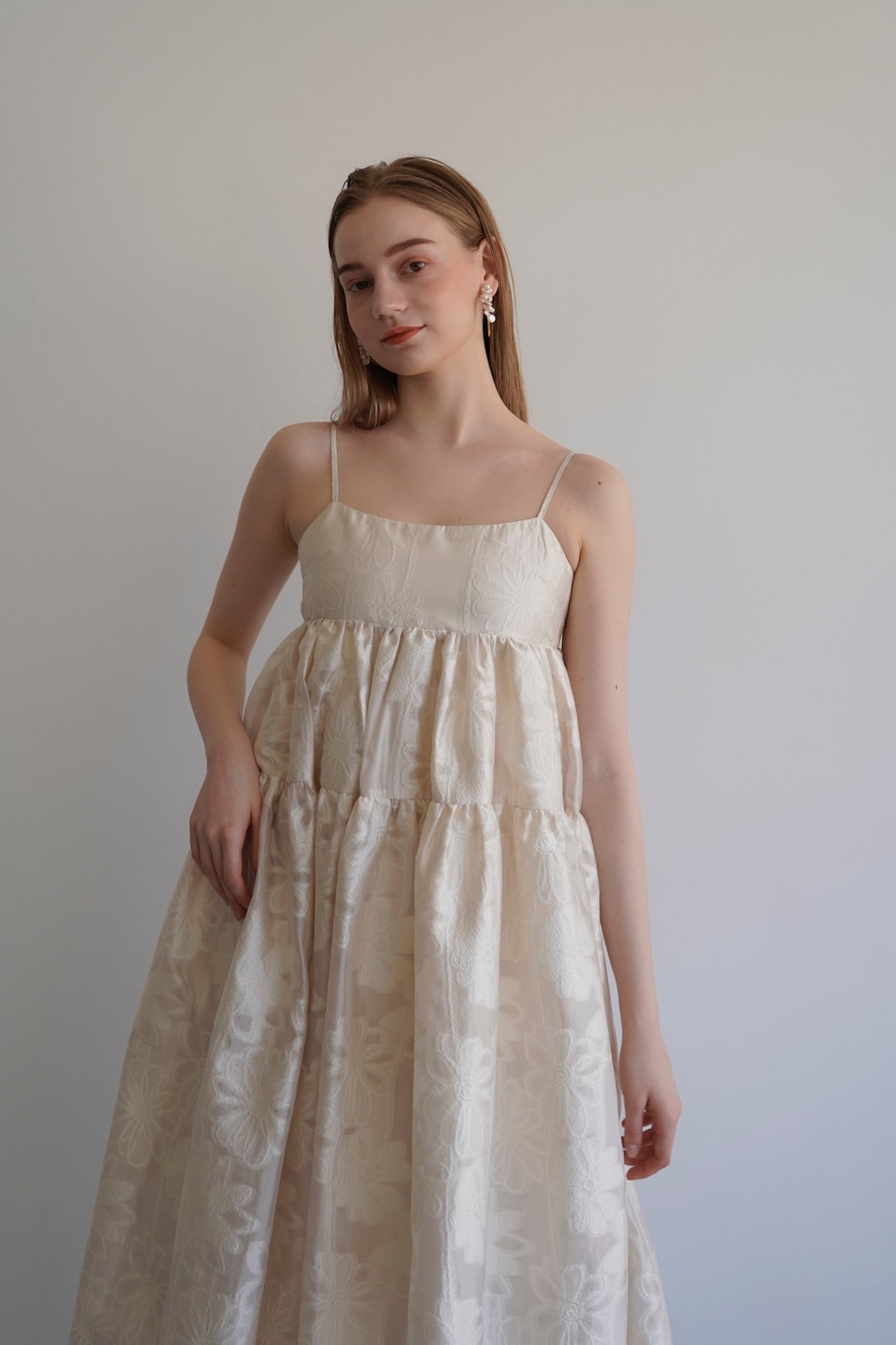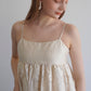 広がりすぎないフレアシルエットに華奢なストラップが特徴のアイテム。