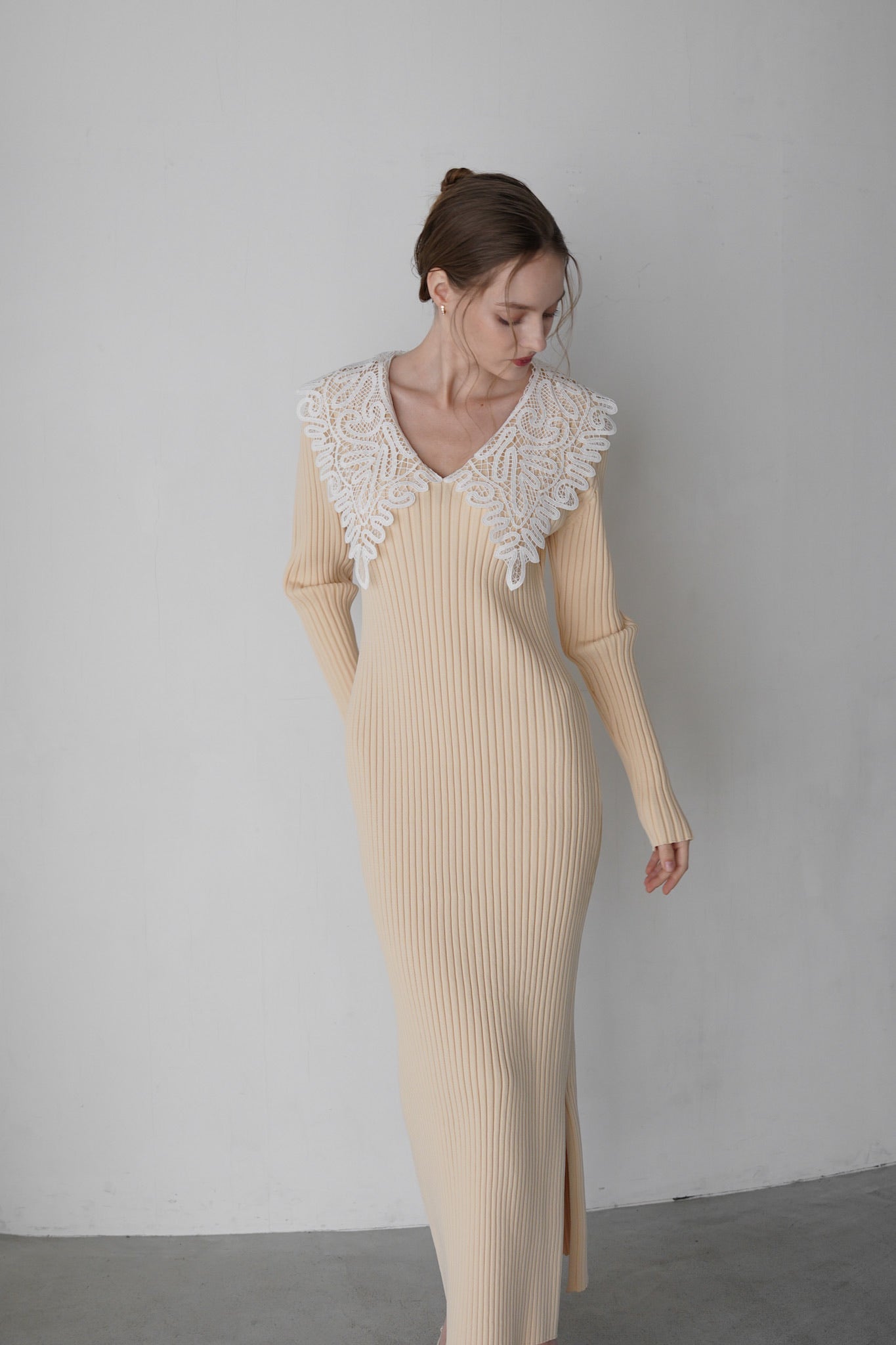 繊細なレースカラーが目を惹く、リブニットワンピース。