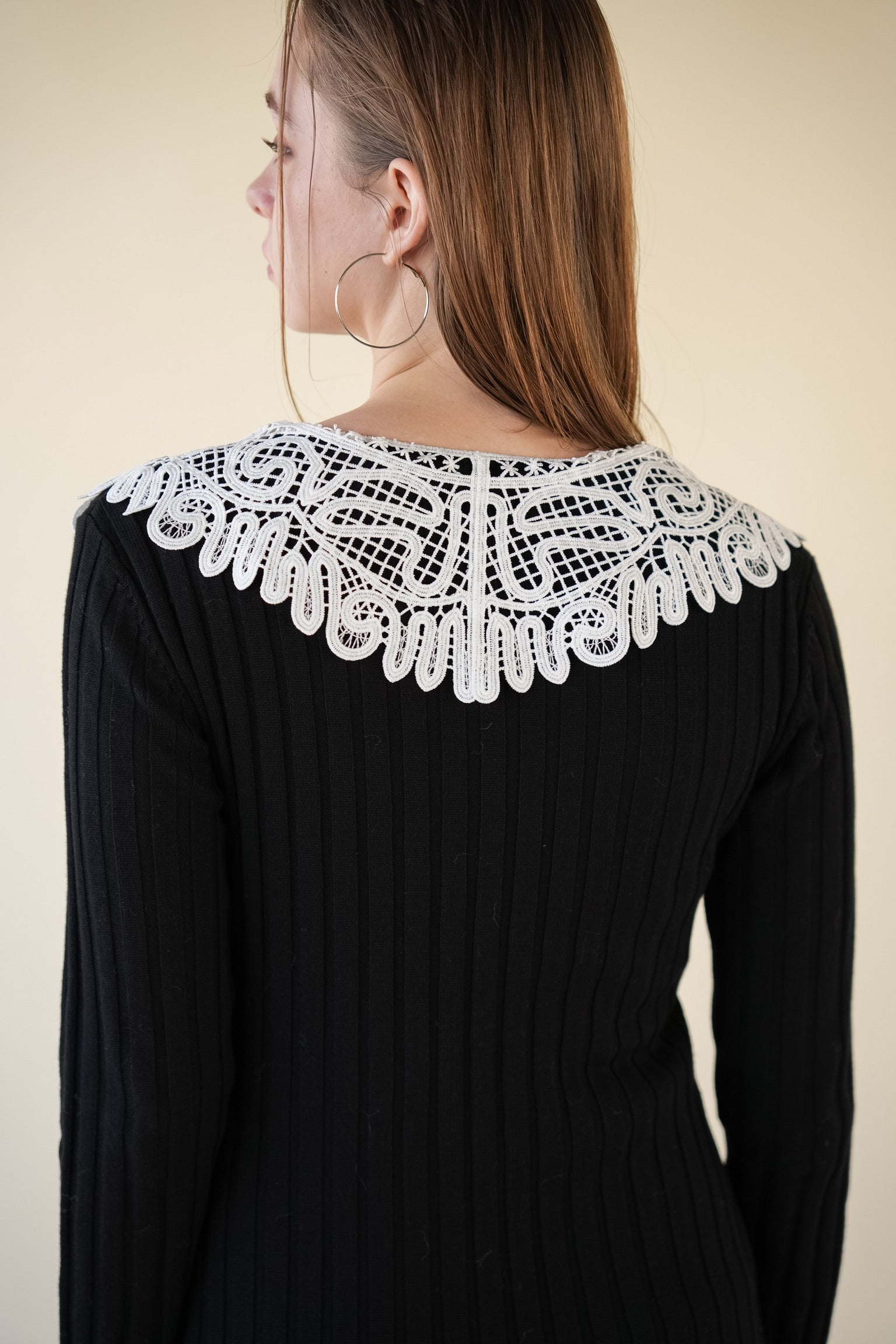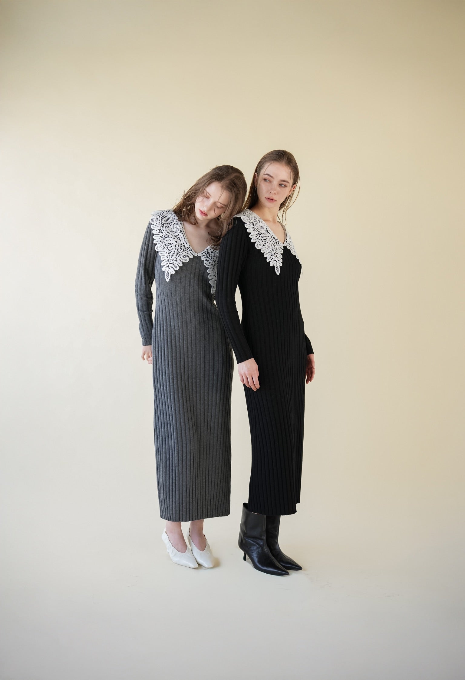 繊細なレースカラーが目を惹く、リブニットワンピース。