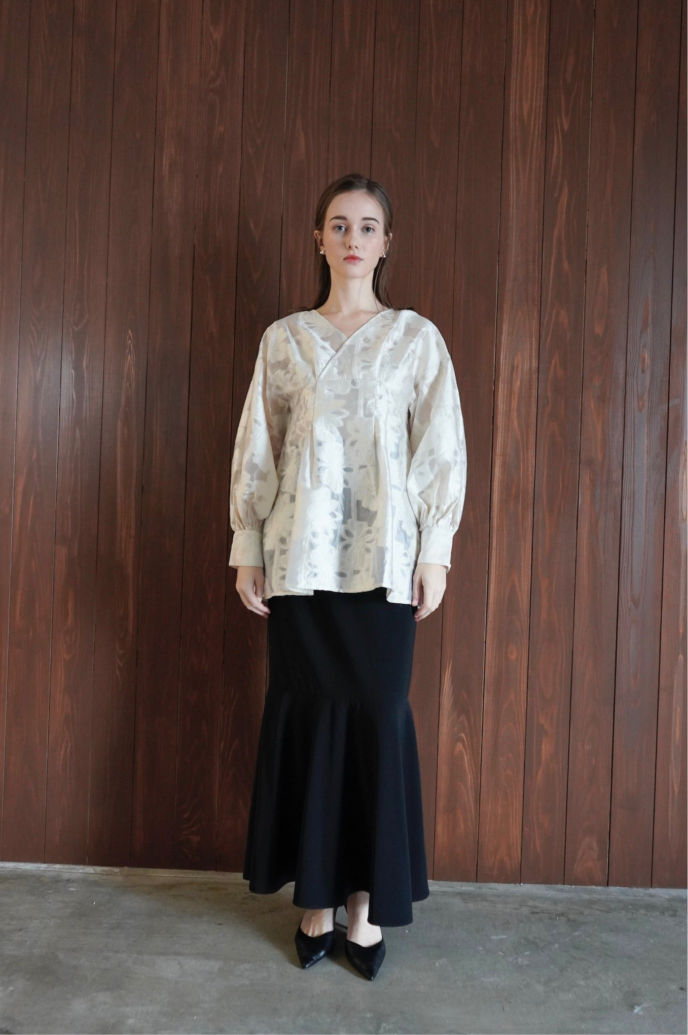 胸元の切り替えを高めに設定し、脚が長く見えるようデザインしました。