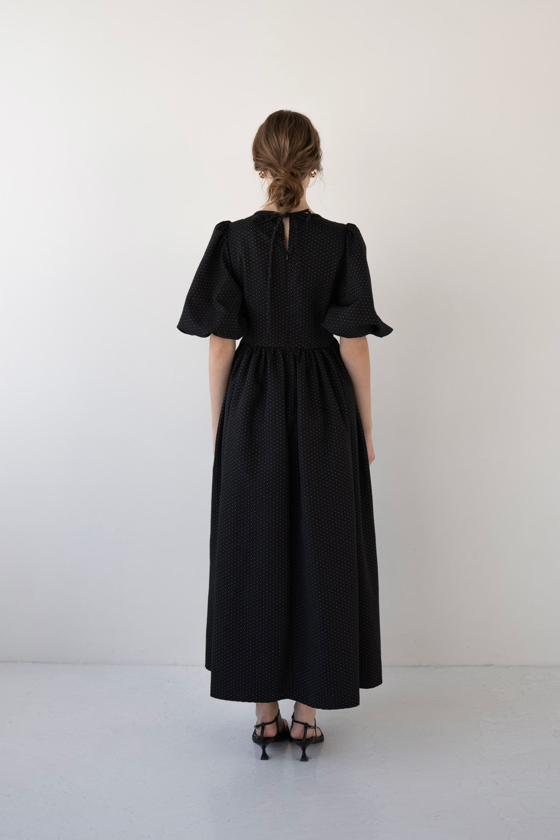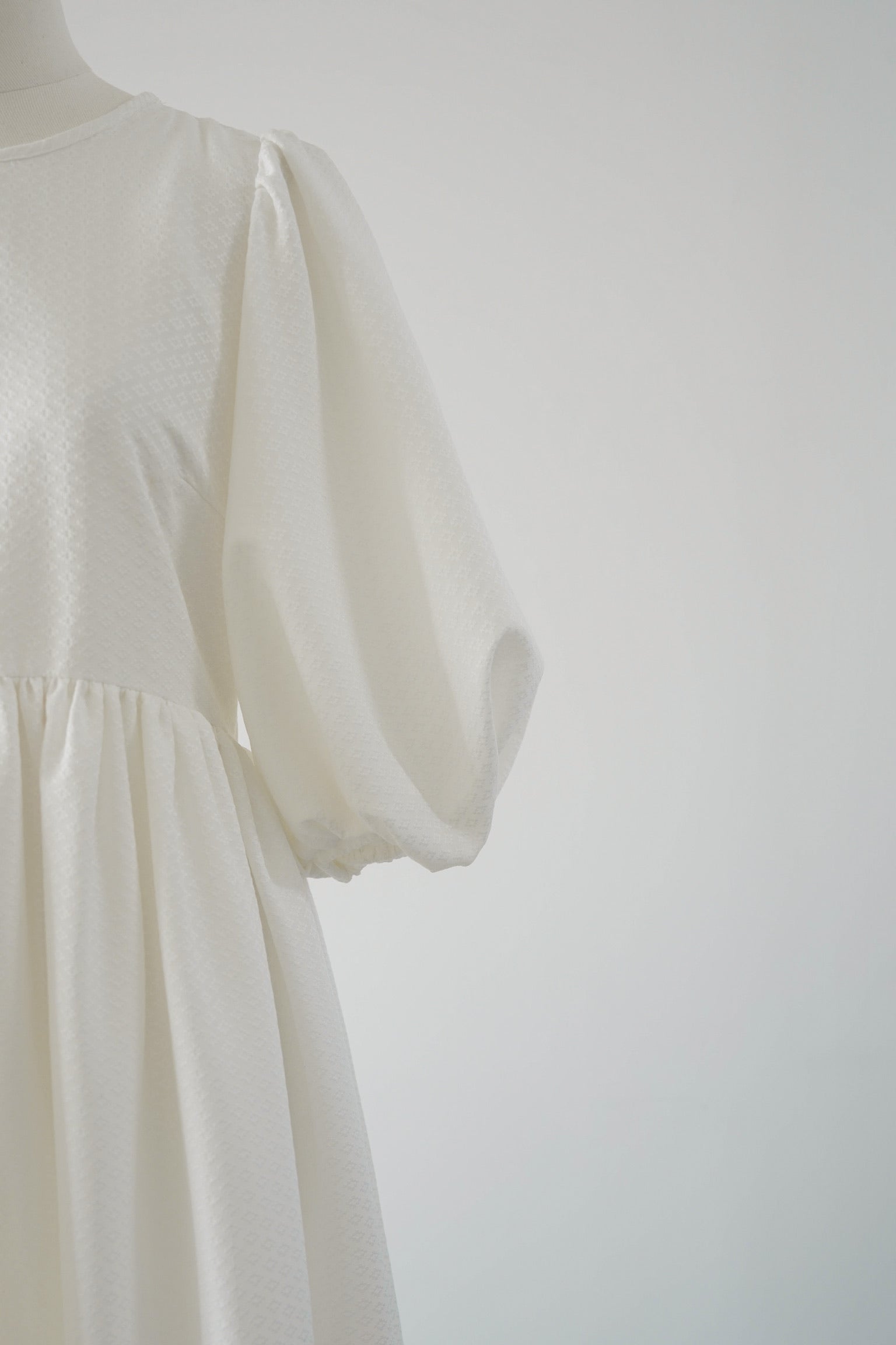 五分丈でデザインされたパフスリーブは甘くなり過ぎない上品な印象に。