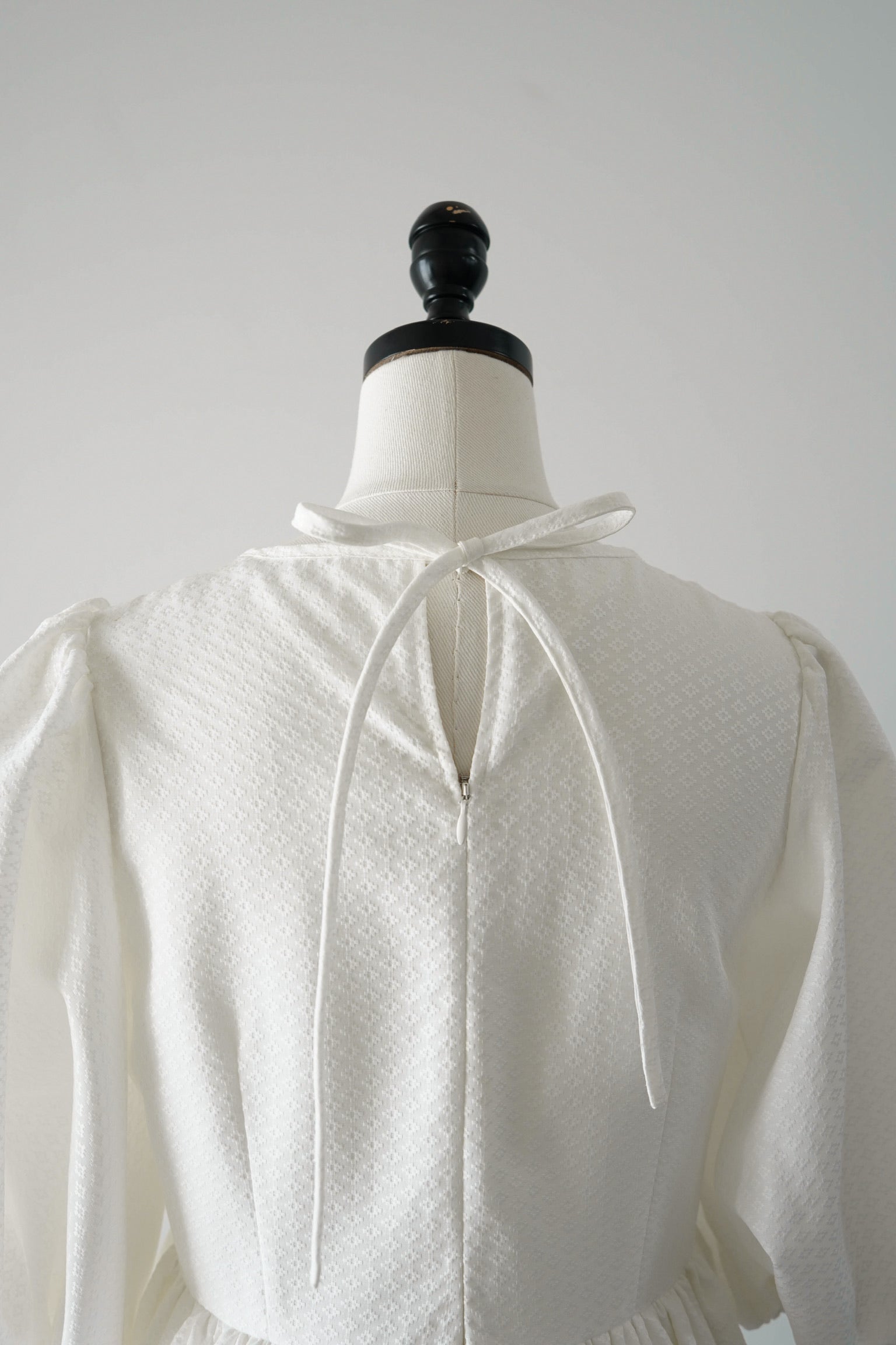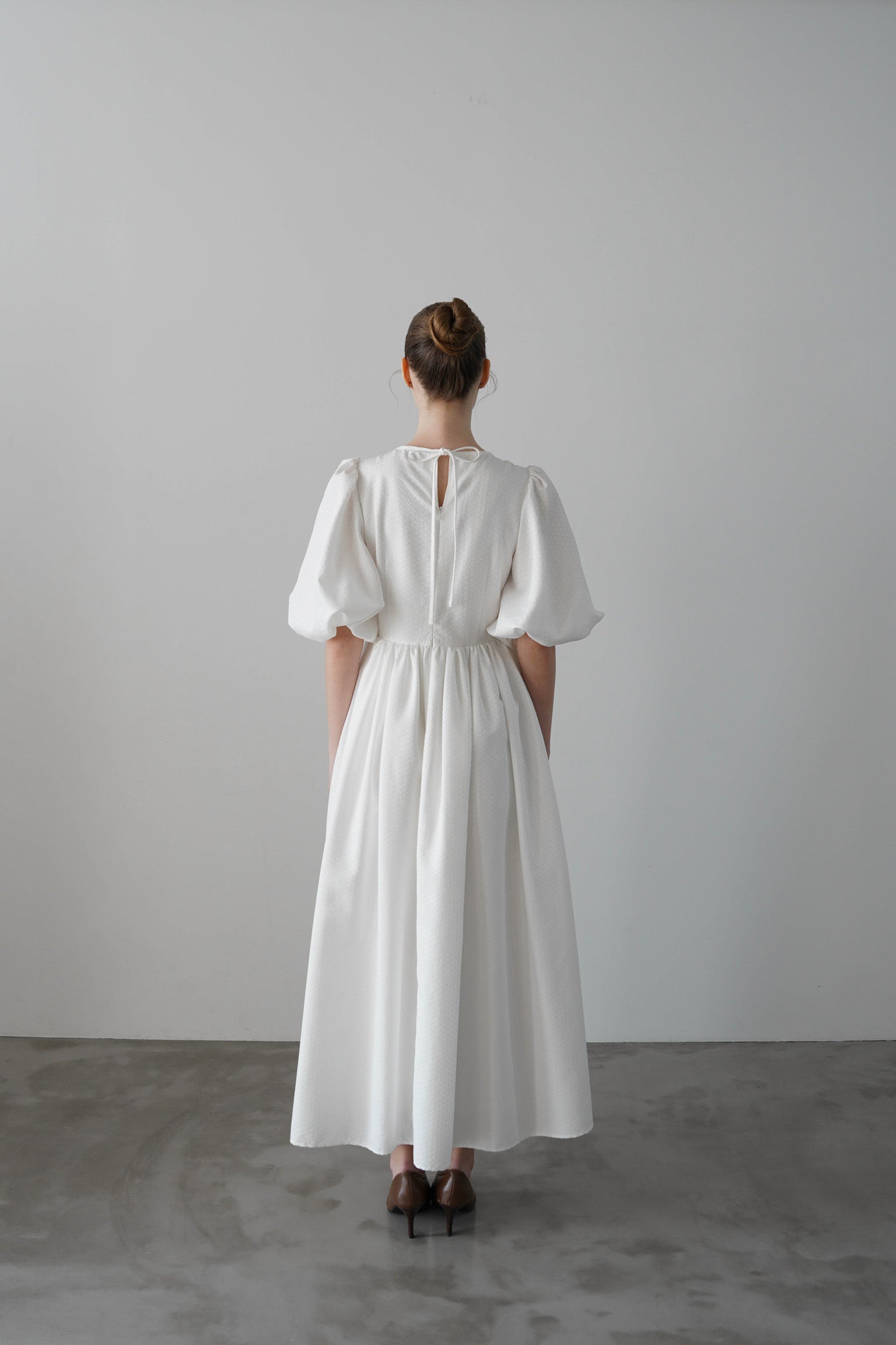 愛らしいふんわりとした柔らかなボリュームとシルエット作りにこだわり、女性らしい優美さを表現した一着です。