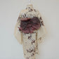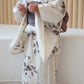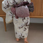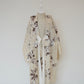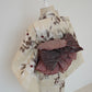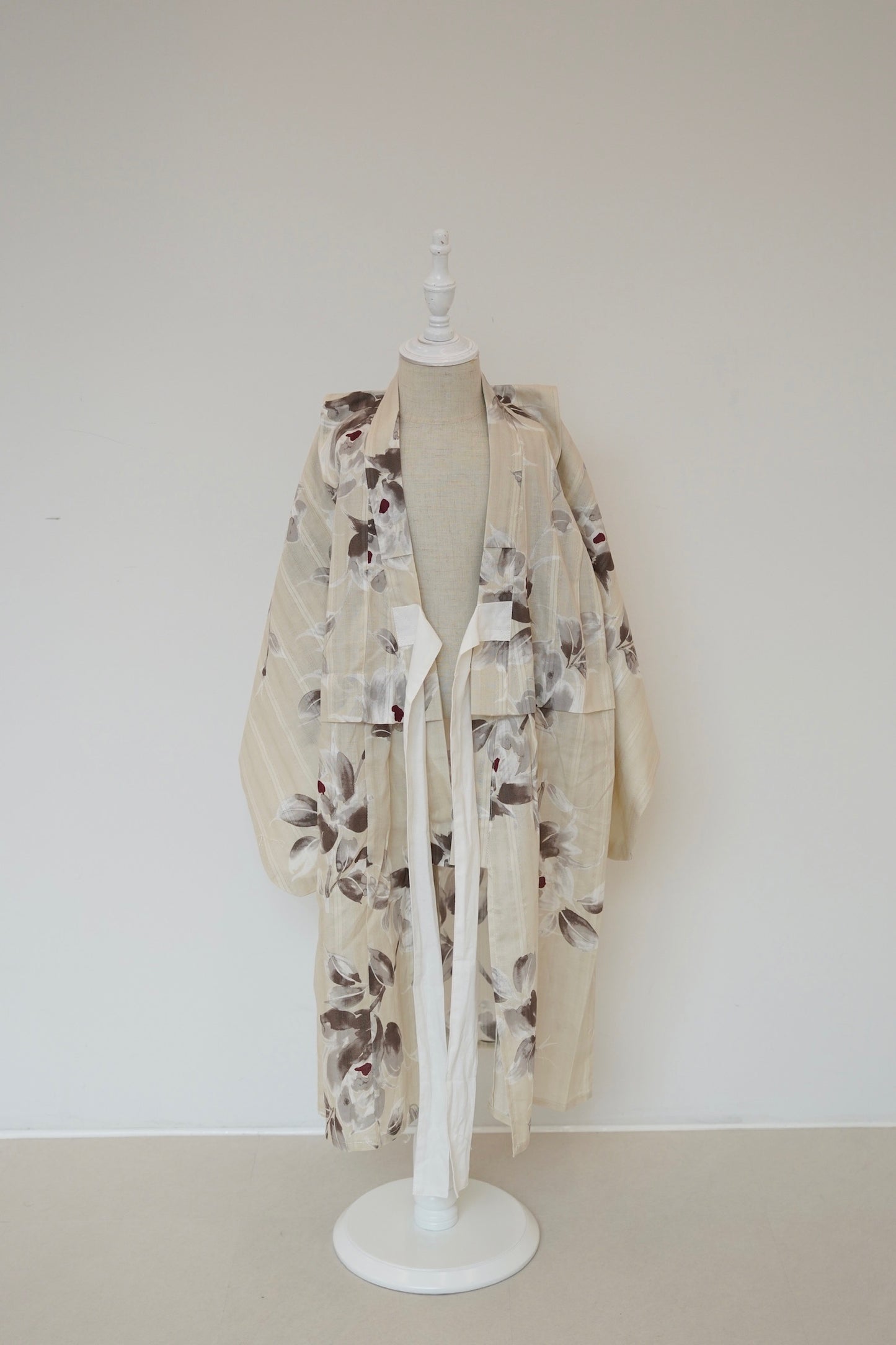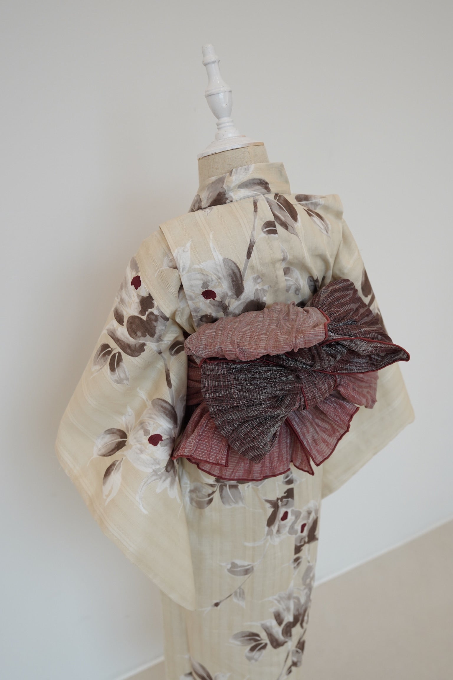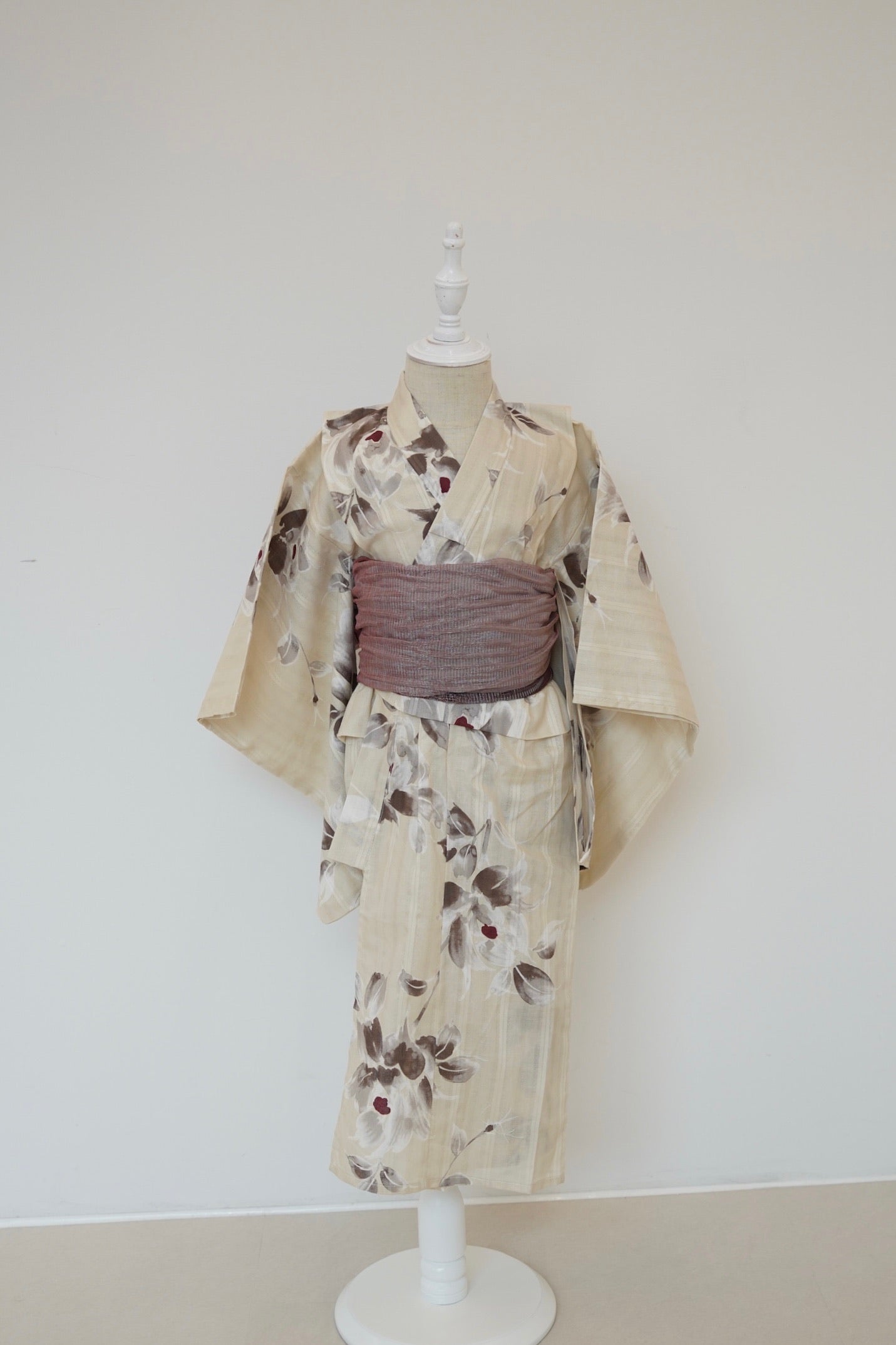淡い胡桃染を思わせるベージュ地に、ブラウンと墨色を溶かしたような花模様がふわりと描かれた、柔らかく上品な一着です。