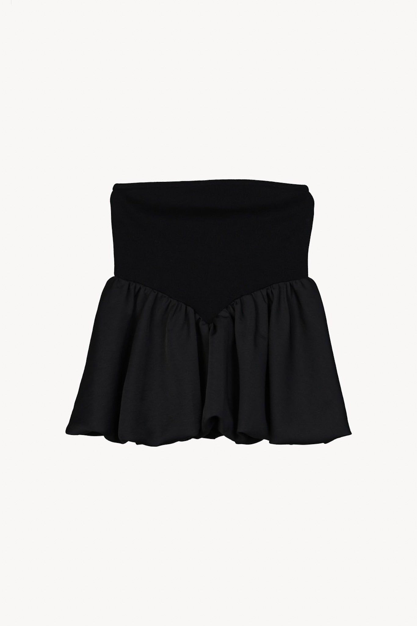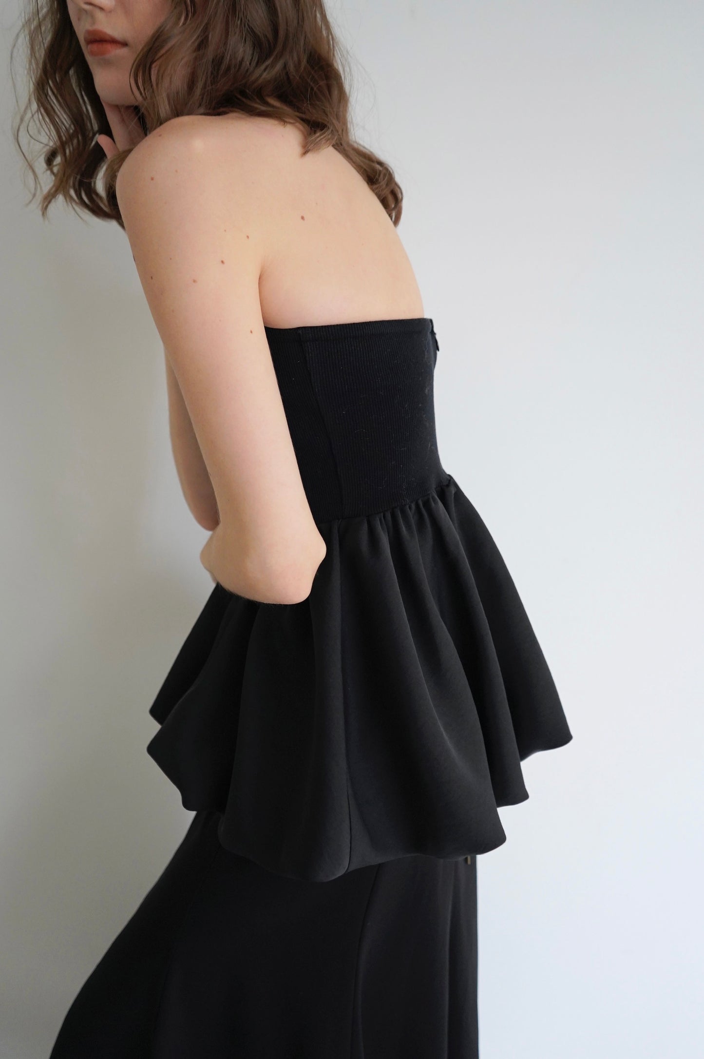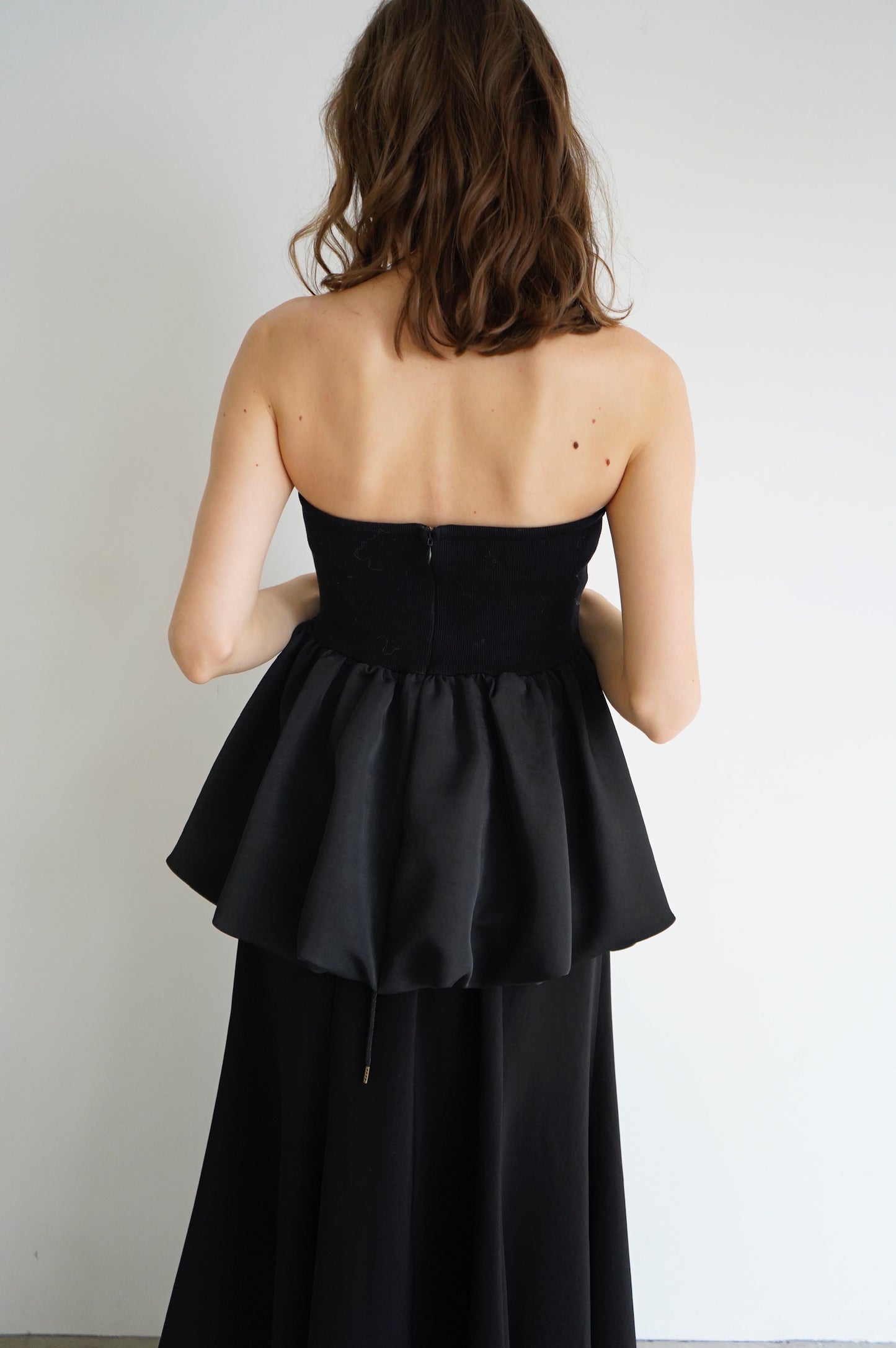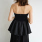リブ×サテンをドッキングさせた ペプラムシルエットのベアトップ。