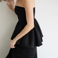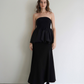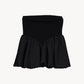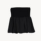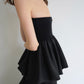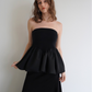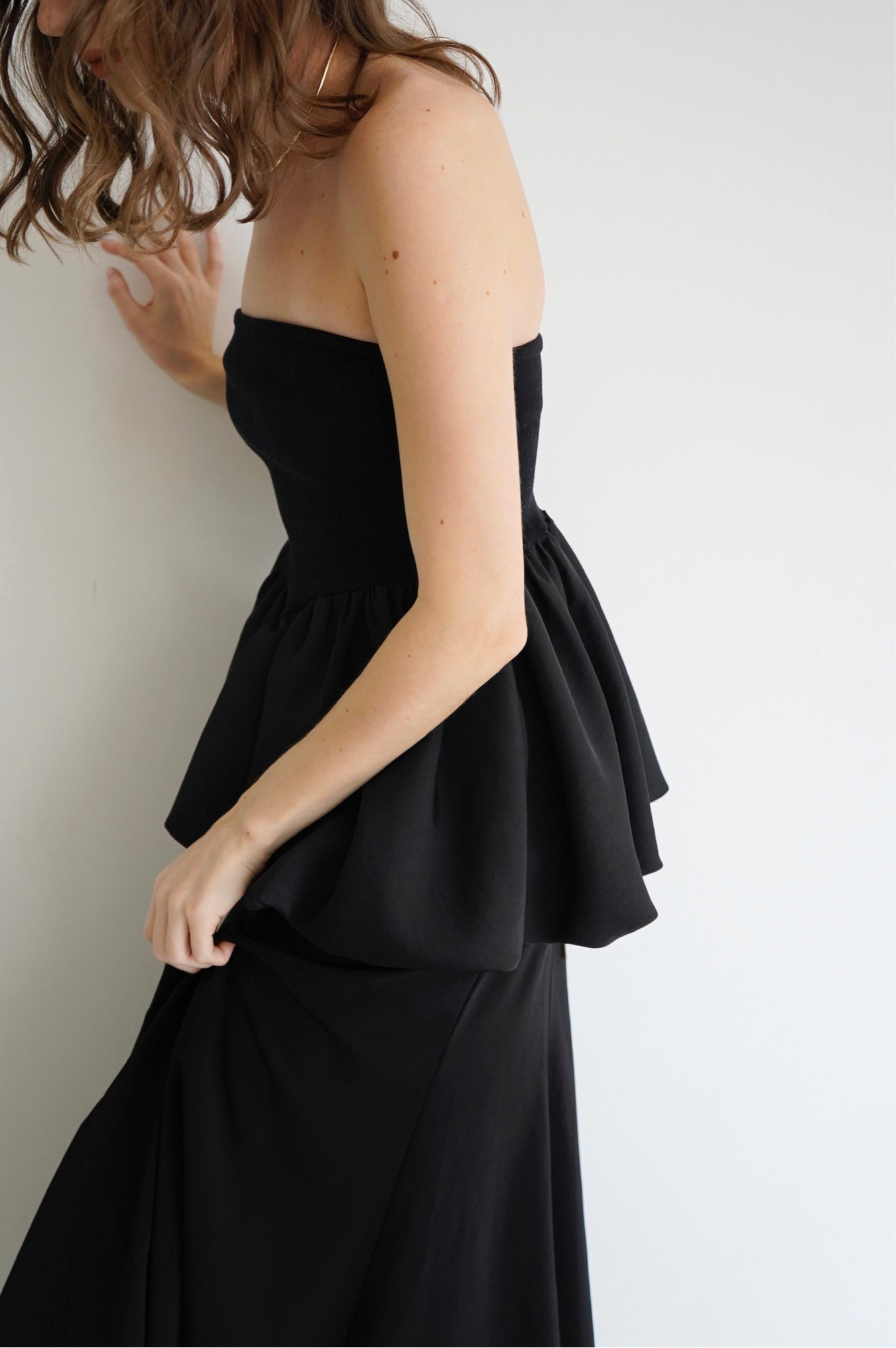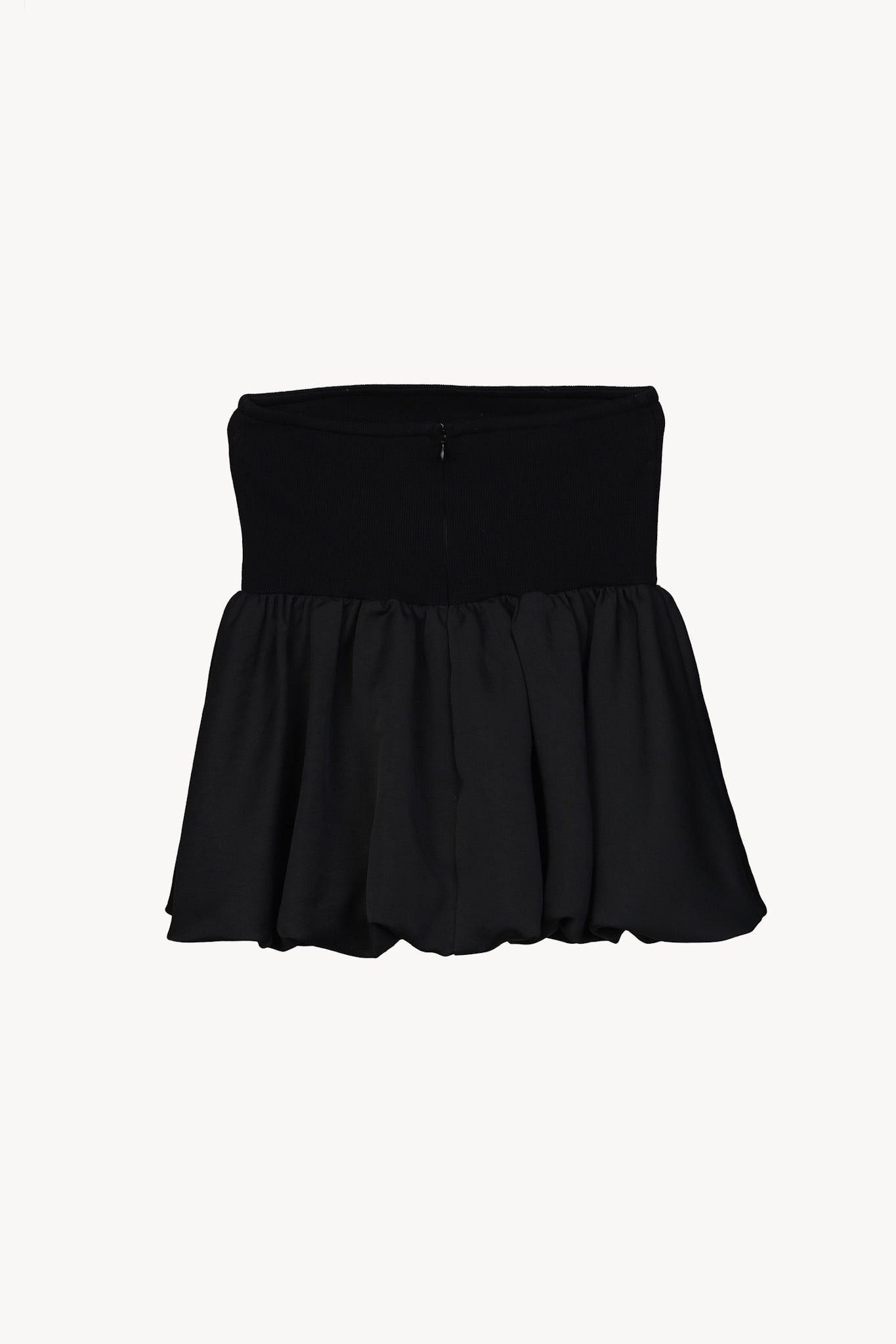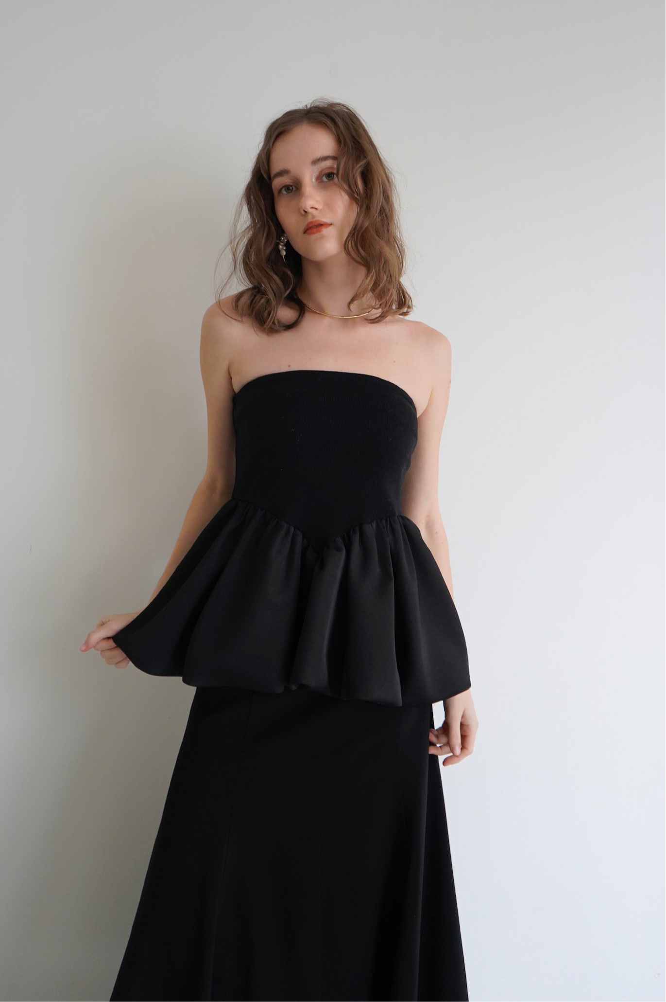 リブ×サテンをドッキングさせた ペプラムシルエットのベアトップ。