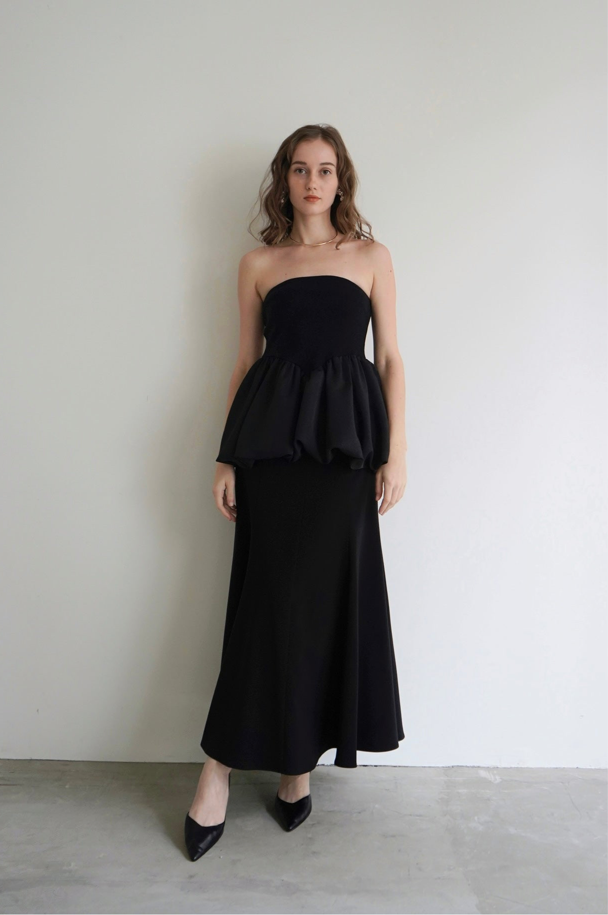 ペプラムシルエットは、 ドライでさらっとしたタッチのサテン生地を使用し、